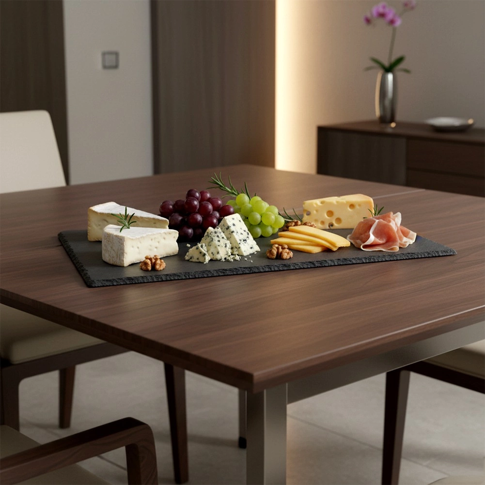 De plaat van natuurlijke leisteen met geslepen randen en authentieke textuur accentueert de geserveerde gerechten en geeft de tafel een moderne uitstraling.