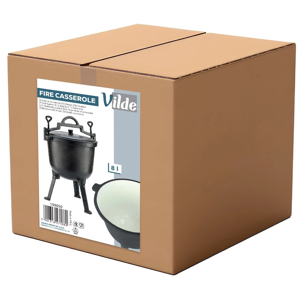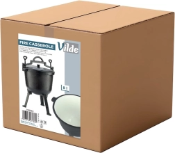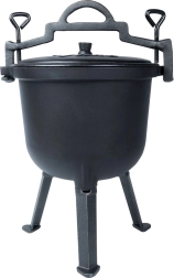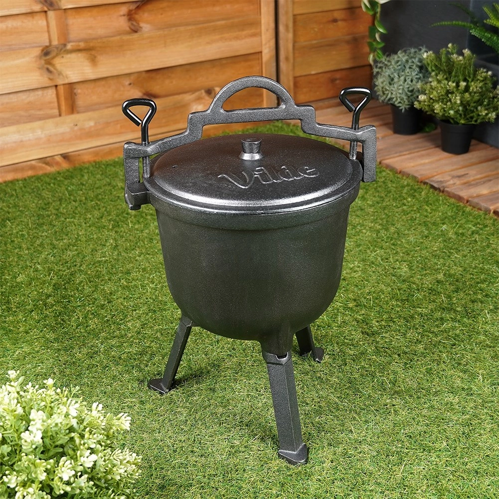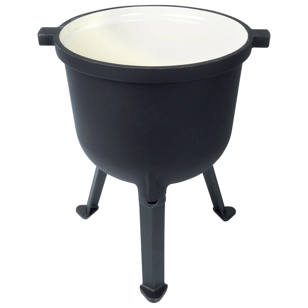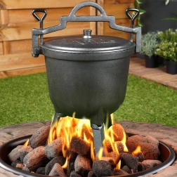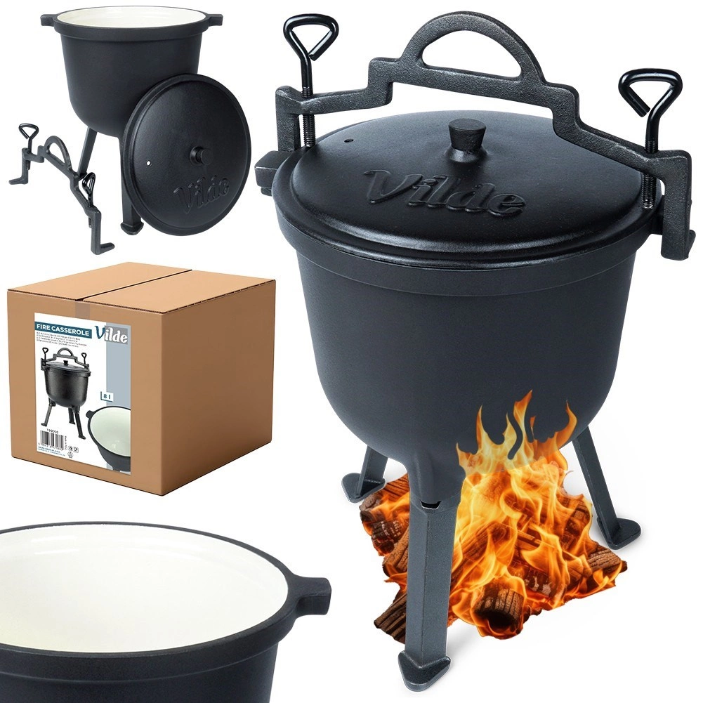 Robuuste buitenketel van 8 l met driepoot en deksel, ideaal om boven open vuur in de tuin, op de grill of tijdens het kamperen te koken. Het gietijzeren lichaam met een geëmailleerde binnenzijde in beige zorgt voor een gelijkmatige warmteverdeling, houdt de warmte lang vast en maakt reinigen eenvoudig. De stabiele drie poten, het massieve draaghengsel en de zijgrepen verhogen veiligheid en comfort. Dankzij het slijtvaste gietijzer is de ketel duurzaam en geschikt om te stoven, bakken en braden met een onmiskenbare geur en smaak van gerechten.