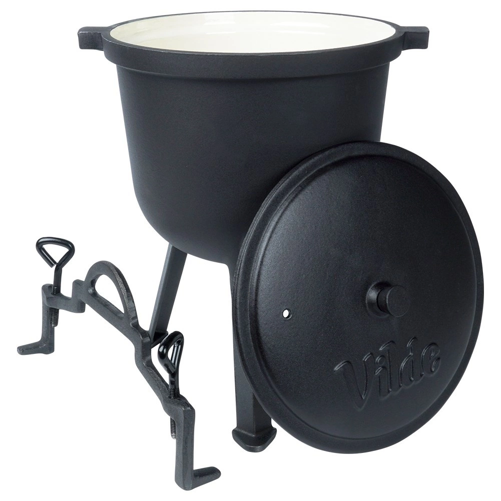 De VILDE-ketel uit de CAST LINE is gemaakt van zwart gietijzer met een glad, niet-poreus, beige email aan de binnenkant. Dit is duurzaam, niet-reactief en helpt aanbranden te voorkomen. Drie stevige poten zorgen voor stabiliteit boven het vuur, terwijl het deksel met ventilatieopening en de mogelijkheid om met twee schroeven vast te zetten de warmte en sappen binnen houdt.