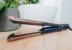 Stylen is zacht en effectief dankzij keramische stylingplaten met gelijkmatige warmteverdeling en zwevende platen die zich aanpassen aan de dikte van de lok zonder trekken. De buitenzijde van de tang heeft een titanium afwerking voor hogere duurzaamheid en lange levensduur. Je stelt de temperatuur in vijf stappen in: 140/160/180/200/220 °C afhankelijk van je haartype; de laagste stand is al na 30 seconden klaar.