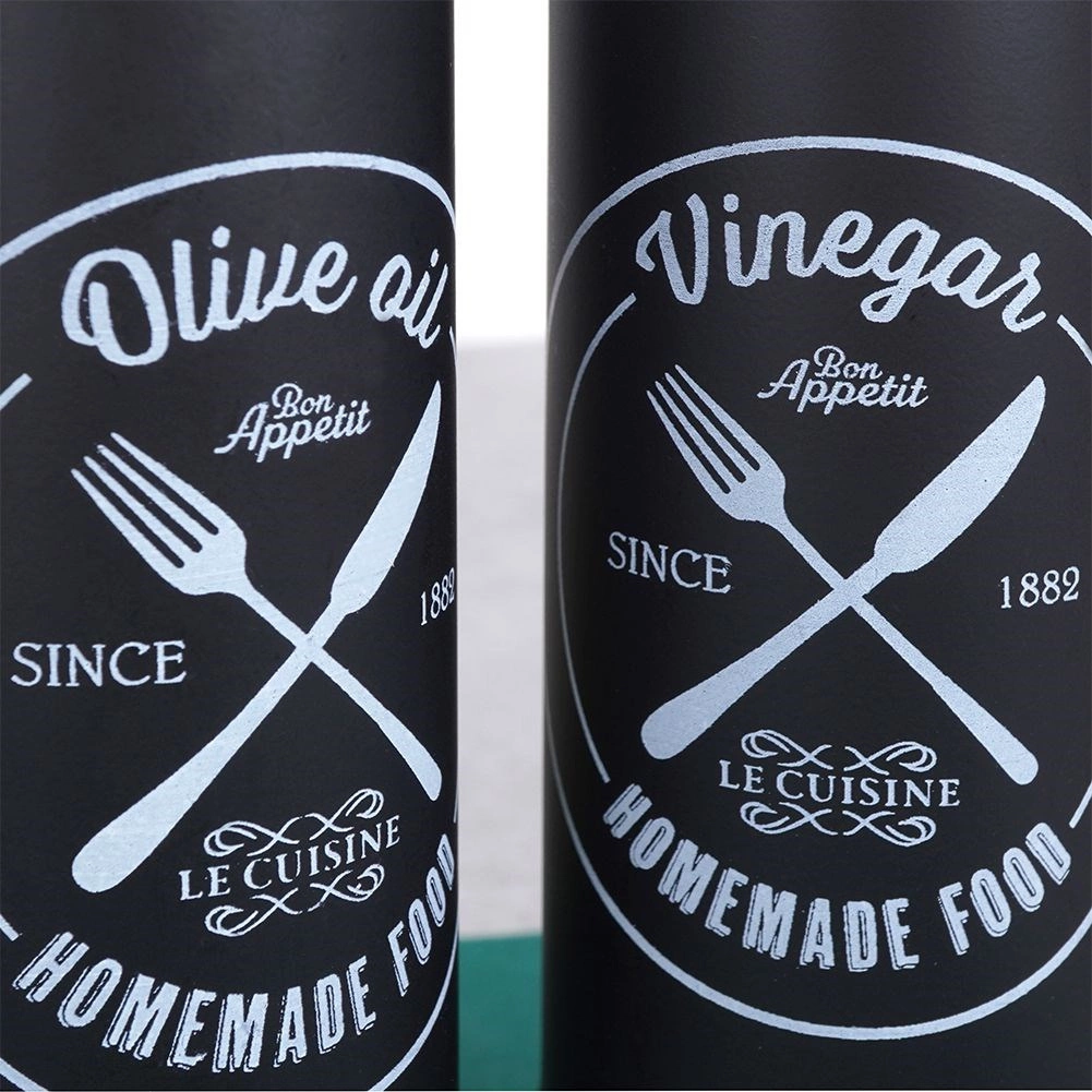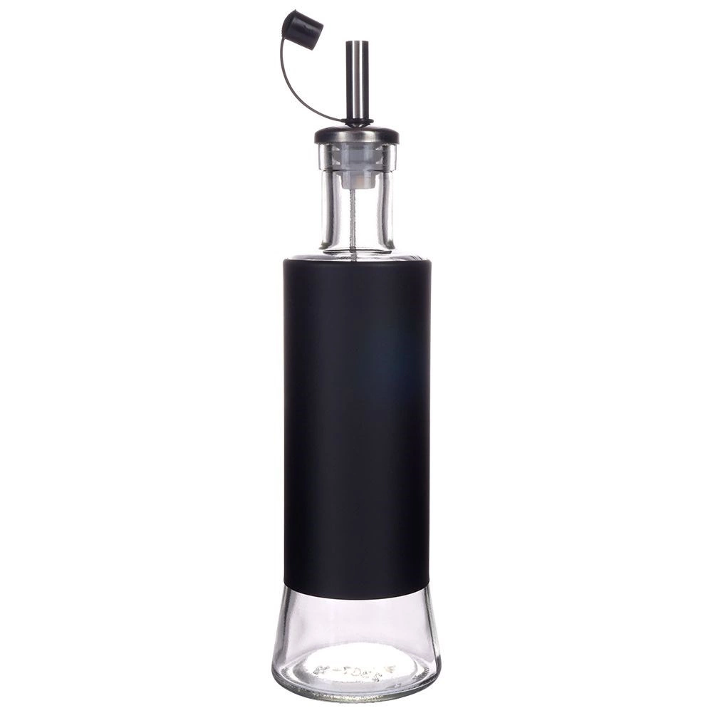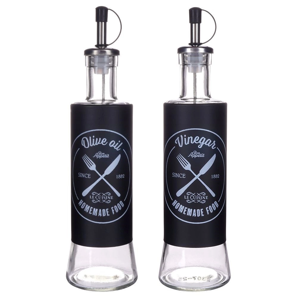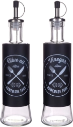 Elegante set van twee glazen flessen van 300 ml voor olijfolie en azijn met een metalen doseerdop en beschermkap. Biedt nauwkeurige dosering, druppelvrij schenken en een modern zwart design met witte opdruk voor eenvoudige herkenning. Ideaal voor in de keuken en horeca.