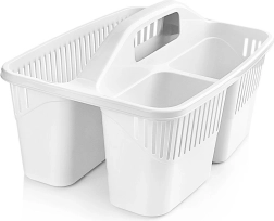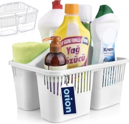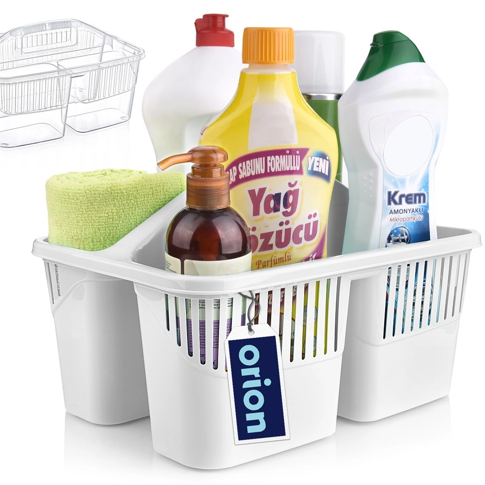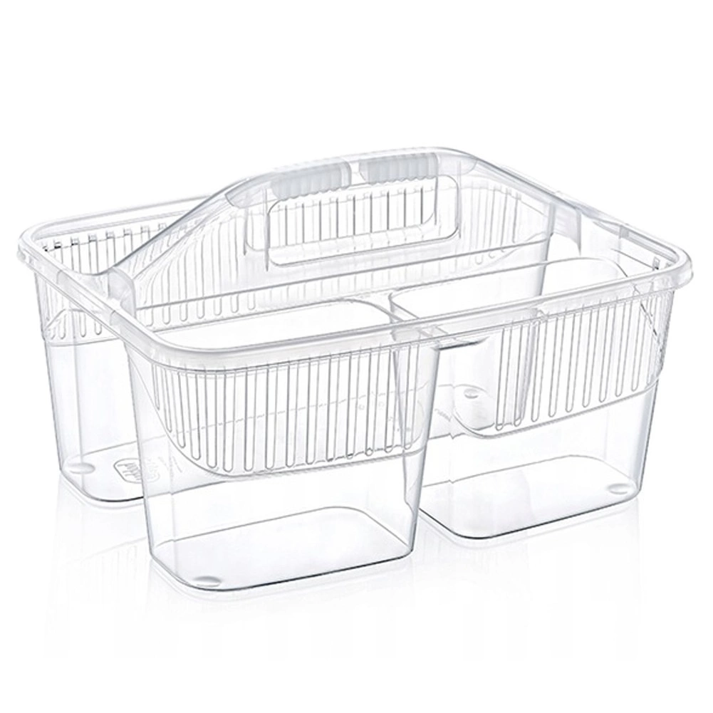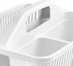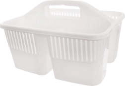 Houd orde tijdens het schoonmaken met de compacte organizer voor detergenten met drie gescheiden vakken. Dankzij het stevige centrale handvat verplaats je alle benodigde middelen, borstels en sponsjes gemakkelijk van kamer naar kamer. De mand is gemaakt van hoogwaardige kunststof in een witte of transparante variant (we verzenden willekeurig), is licht, duurzaam en eenvoudig schoon te houden.