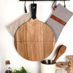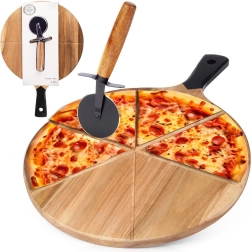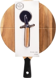 Praktische set voor pizzaliefhebbers: houten plank van acaciahout met geleidingsgroeven voor 6 gelijke stukken en een metalen pizzasnijder met houten handvat. Dubbelzijdig te gebruiken, stijlvol serveren, comfortabel dragen dankzij het lange handvat en bestendig tegen vocht en temperaturen tot 70 °C.
