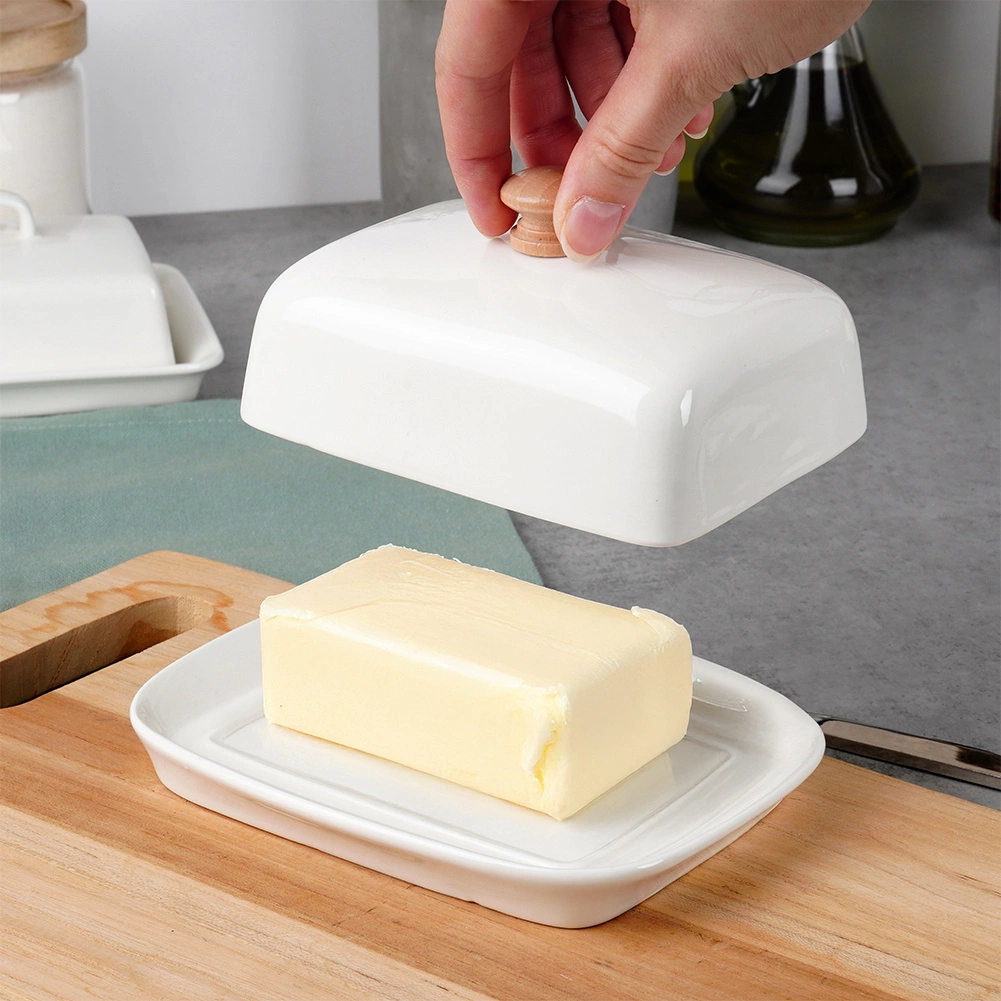 Deze stijlvolle witte keramische botervloot is een praktische aanvulling voor elk huishouden. Dankzij het stevige deksel met een houten knop blijft boter beschermd tegen lucht en ongewenste geuren, terwijl het elegante design zowel op het aanrecht als op een feestelijk gedekte tafel past.