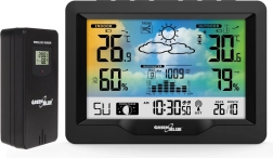 Het grote kleur LCD-scherm is overdag en ’s nachts uitstekend leesbaar en toont overzichtelijk ook weersvoorspellingsiconen, datum en dag en de maanfasen. In de verpakking zit een compacte draadloze sensor met een bereik tot 60 m in open terrein.