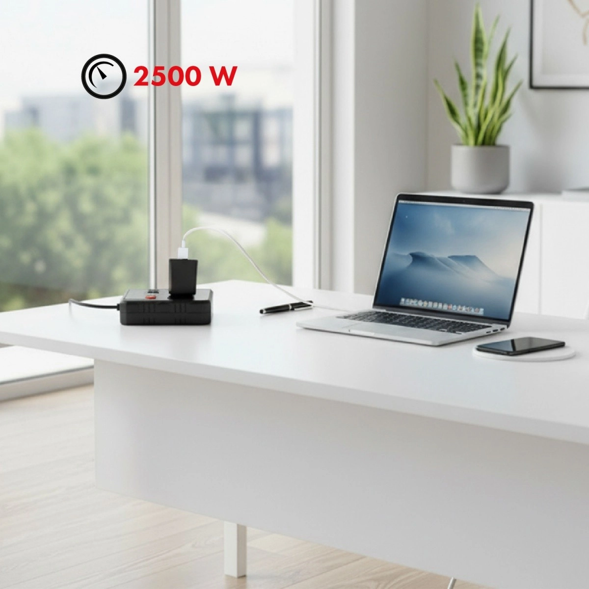 Compacte stekkerdoos met 2 stopcontacten en 3 USB‑poorten, ideaal voor kantoor, woonkamer en slaapkamer. Biedt vermogen tot 2500 W, veilige voeding en bespaart ruimte. Dankzij het moderne design en de praktische uitvoering houd je eenvoudig orde rond je bureau en in huis.