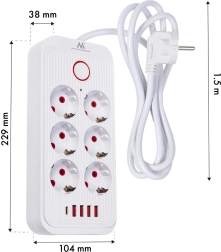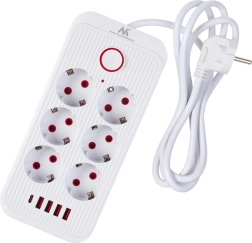 Universele stekkerdoos met 6 stopcontacten en 5 USB‑poorten (4× USB‑A, 1× USB‑C) voor gelijktijdig voeden en laden van meerdere apparaten. Levert 2500 W vermogen, ondersteunt 110–240 V / 50–60 Hz en is dankzij de stevige constructie ideaal voor kantoor, thuis en de gaming‑setup.