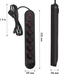 Deze compacte en duurzame voedingsstrip combineert klassieke stopcontacten met ingebouwd USB-opladen, zodat je ruimte en adapters bespaart. Het brede bereik van de ingangsspanning 110–240 V AC (50/60 Hz) garandeert betrouwbare werking onder uiteenlopende omstandigheden en de maximale belasting van 2500 W dekt de meeste standaardapparaten.
