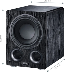 De robuuste behuizing van MDF is verkrijgbaar in de afwerkingen zwart essen of mokka. Dankzij de compacte afmetingen laat hij zich makkelijk plaatsen, ook in kleinere ruimtes; het afneembare stoffen front onderstreept het strakke design. Ideale keuze als subwoofer voor homecinema en stereo systemen, merkonafhankelijk.