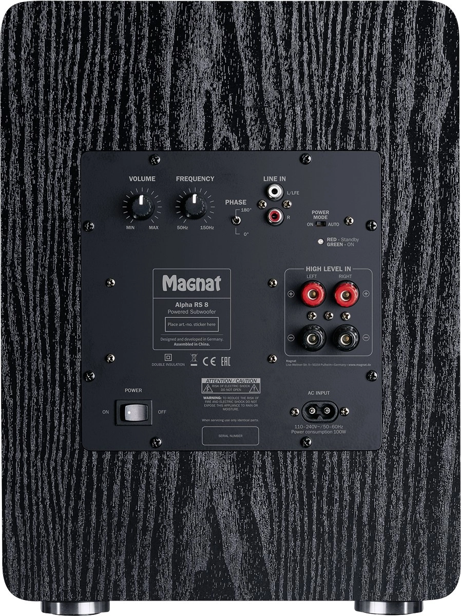 De Magnat Alpha RS 8 is een krachtige en tegelijk ruimtebesparende subwoofer voor homecinema en hifi. Dankzij de geïntegreerde klasse‑D versterker levert hij 80 W RMS en tot 160 W piekvermogen. De 200 mm (8") basdriver met een gecoate papieren conus en een Klippel‑geoptimaliseerd magneetsysteem garandeert een snelle respons en diepe, gecontroleerde bas.