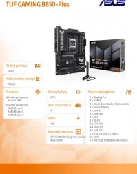 Het ASUS TUF GAMING B850‑Plus WiFi moederbord is gebouwd voor de nieuwste AMD Ryzen‑processors voor socket AM5 en combineert duurzame betrouwbaarheid, stabiele stroomvoorziening en efficiënte koeling. Dankzij ingebouwde Wi‑Fi, ondersteuning voor DDR5 en beelduitgangen HDMI/DisplayPort biedt het een betrouwbare basis voor gaming‑pc’s en veeleisende toepassingen, inclusief AI.