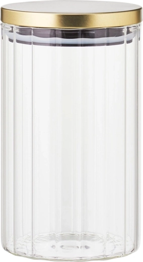 Een elegante en functionele pot voor dagelijks opbergen in de keuken. Het transparante borosilicaatglas biedt directe zichtcontrole op de inhoud en laat je etenswaren mooi uitkomen. Het metalen deksel in goudkleur met siliconen afdichting zorgt voor een luchtdichte afsluiting en langere versheid.
