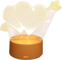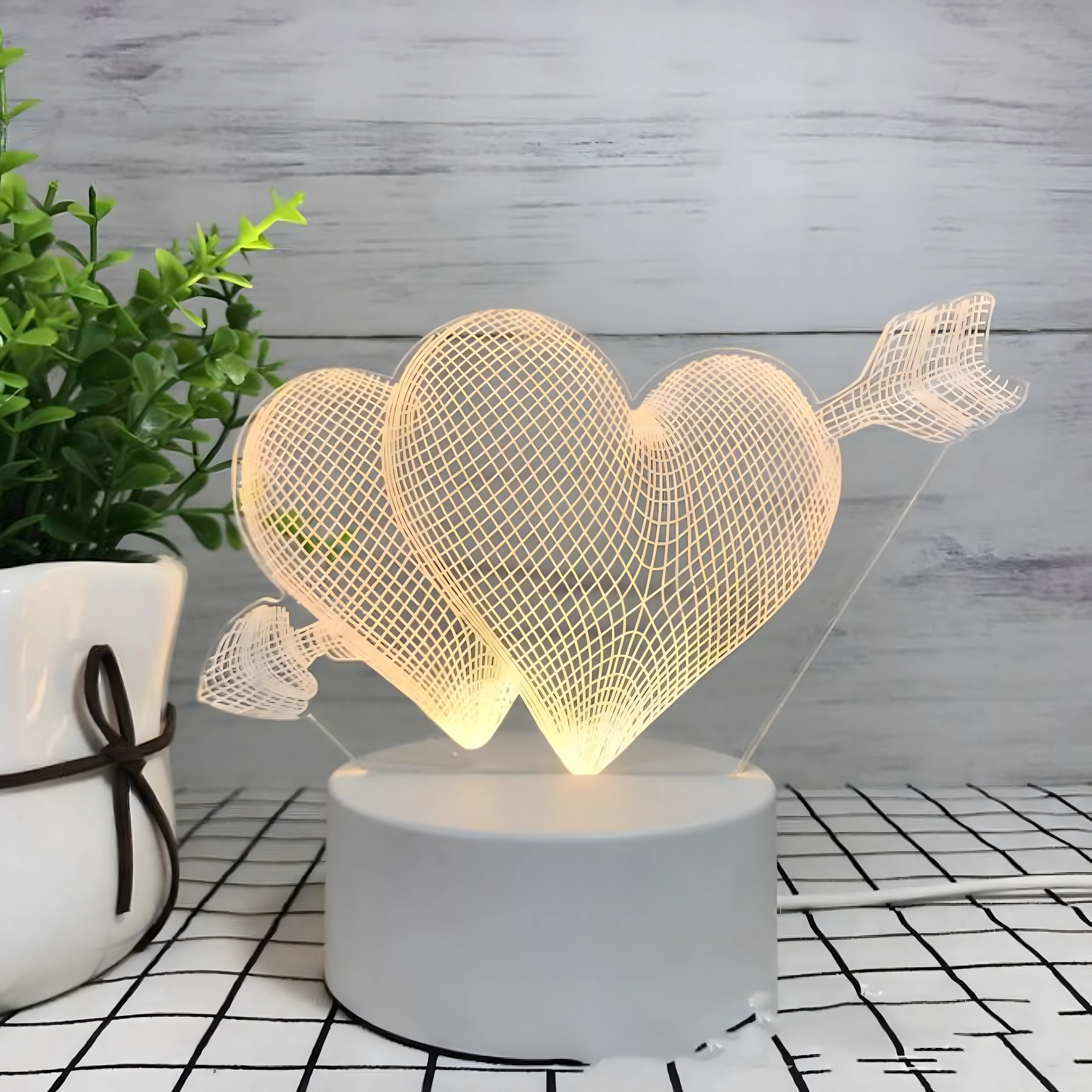 Breng je interieur tot leven met een magisch spel van licht. Het lampje met twee verstrengelde harten en een pijl tekent een subtiele 3D optische illusie, die prachtig uitkomt in de slaapkamer, kinderkamer of woonkamer. Dankzij de compacte basis en de aangename warme tint is het ideaal voor avondlijke ontspanning en als rustgevend nachtlampje.