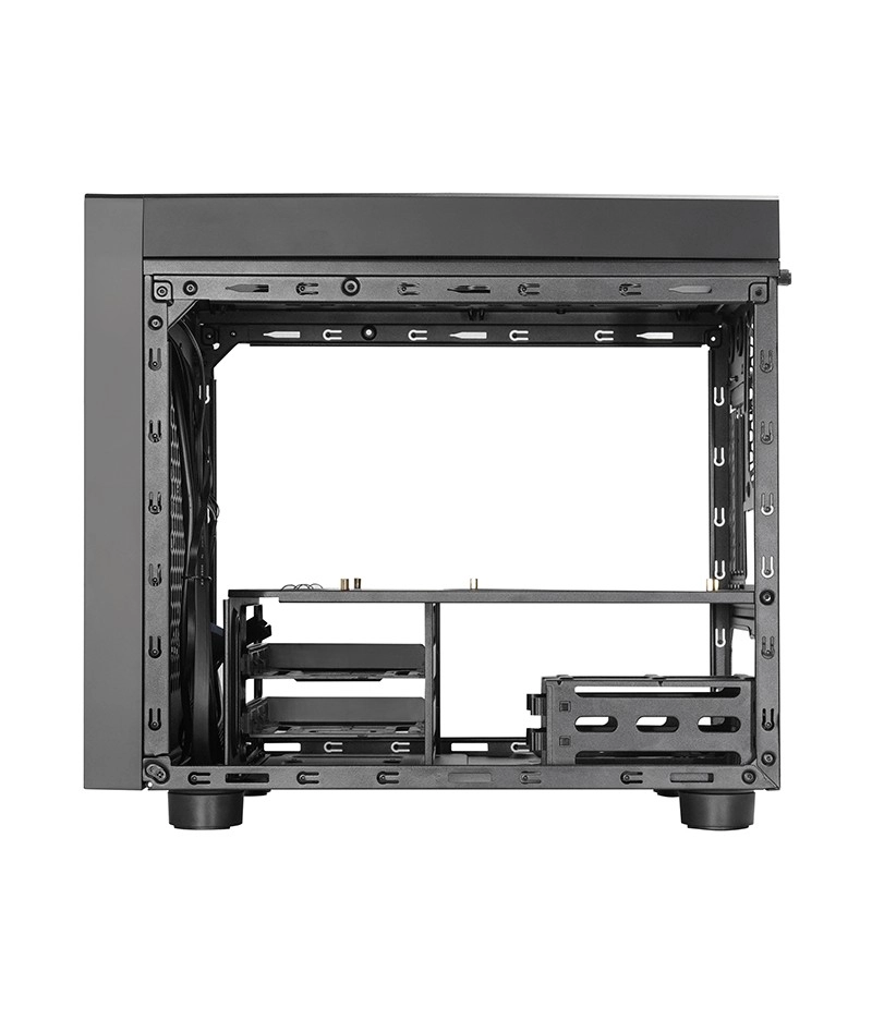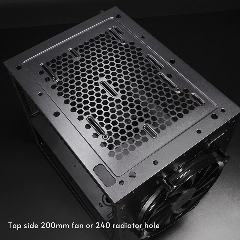 Ondanks de compacte afmetingen biedt de behuizing ruime mogelijkheden: ondersteunt ATX‑voedingen tot 160 mm, CPU‑koelers tot 160 mm en grafische kaarten tot 335 mm. Voor koeling kun je kiezen voor grote 200mm‑ventilatoren aan de voor- en bovenzijde, of de installatie van een radiator van 240 mm. Opslag wordt opgelost met een combinatie van 2× 3,5" HDD en 2× 2,5" SSD.