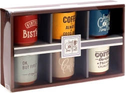 Ontdek het plezier van elke slok met deze designset van 6 keramische espressokopjes. De kleurrijke uitvoering met originele koffie-opschriften geeft je tafel net dat beetje extra, terwijl het compacte volume van 110 ml perfect is voor echte Italiaanse espresso.