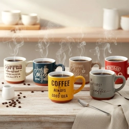 Zes keramische kopjes in verschillende kleuren met koffie-opschriften voor stijlvol serveren van espresso thuis en op kantoor.