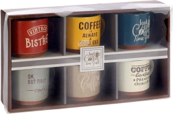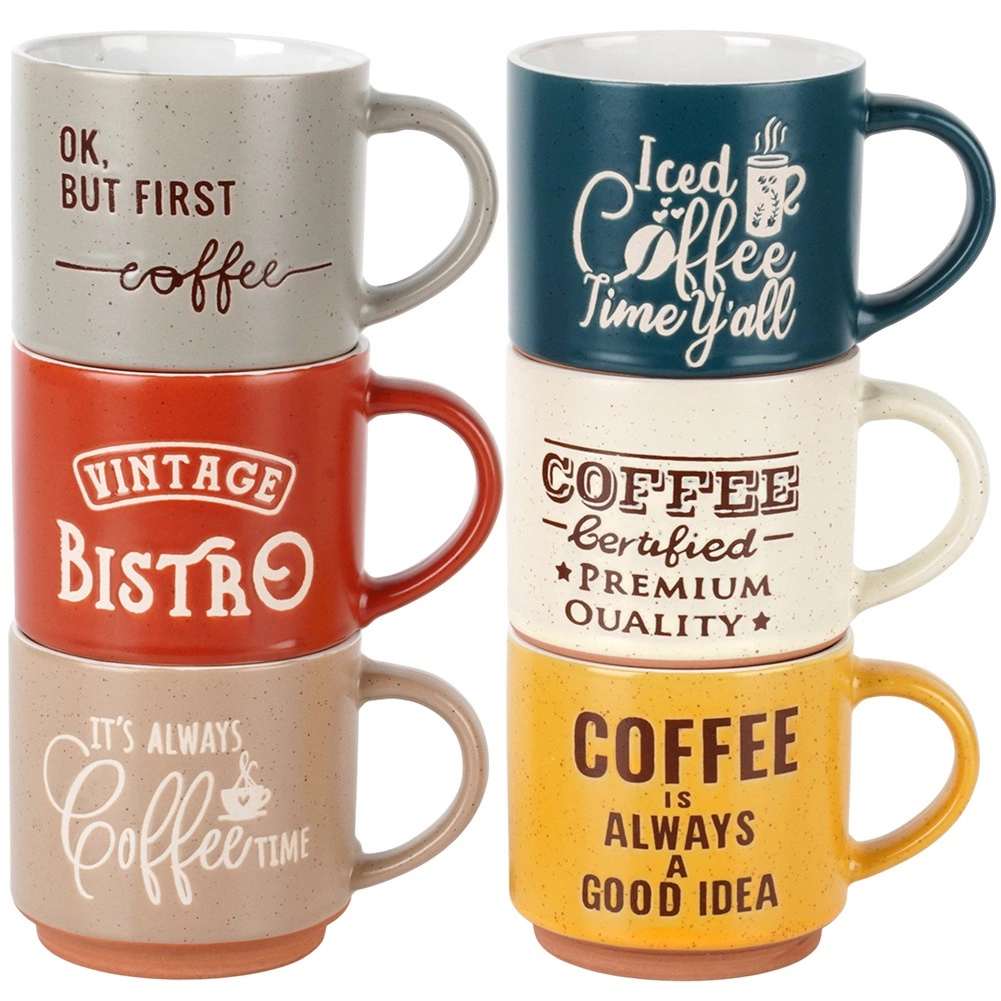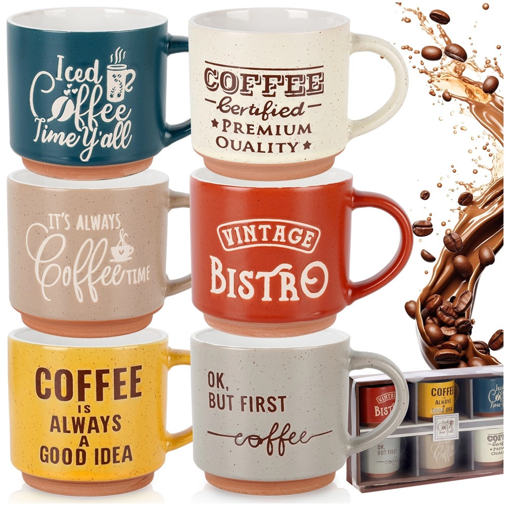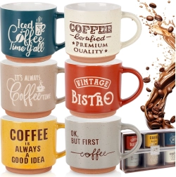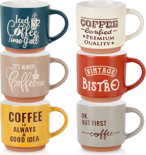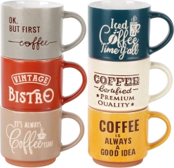 Stijlvolle set van zes keramische mokken met een inhoud van 230 ml in verschillende kleuren, ideaal voor dagelijks koffie- of theedrinken. De mokken hebben een comfortabele oor, zijn gemaakt van duurzaam keramiek en zijn geschikt voor vaatwasser en magnetron. Grappige Koffie-opschriften en een rustieke bistro-look geven de mokken extra charme.