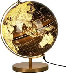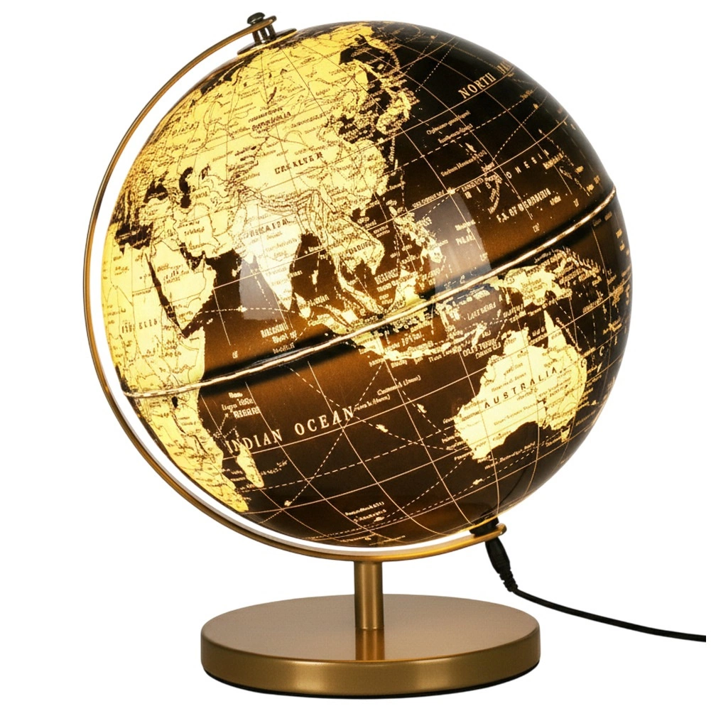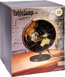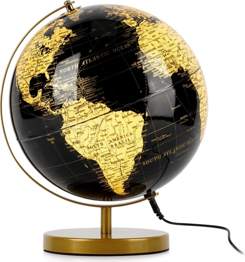 Elegante tafellamp in de vorm van een globe met afmetingen 26 × 25 × 31 cm brengt stijl en functionaliteit in je interieur. De combinatie van zwart en goud, de stabiele metalen voet en warm wit LED-licht creëren een aangename sfeer voor zowel ontspanning als werk. De lamp heeft voeding via USB met een kabel van 1 m en een antislip vilten onderlaag ter bescherming van meubels.