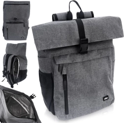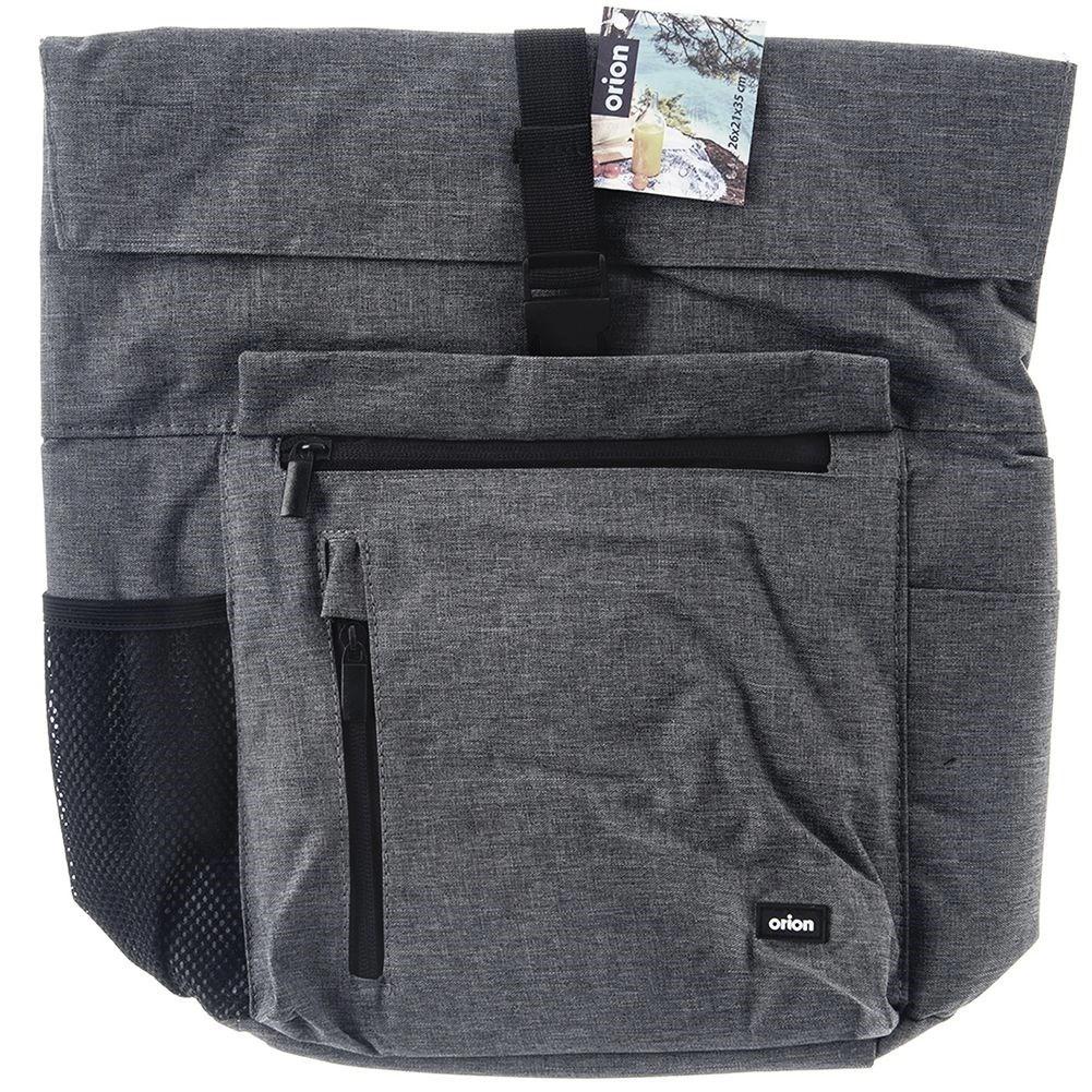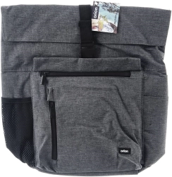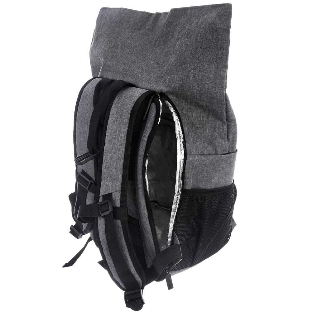 De doordachte indeling zorgt voor snelle toegang: een ruim geïsoleerd compartiment, een voorvak met ritssluiting, een mesh zijvak voor een fles en extra zij‑ en achtervakken met rits voor kleine spullen. De roll‑top sluiting met gesp maakt het mogelijk het volume aan te passen en de inhoud veilig af te sluiten, terwijl het bovenste handvat het dragen vergemakkelijkt.