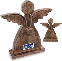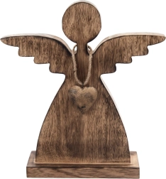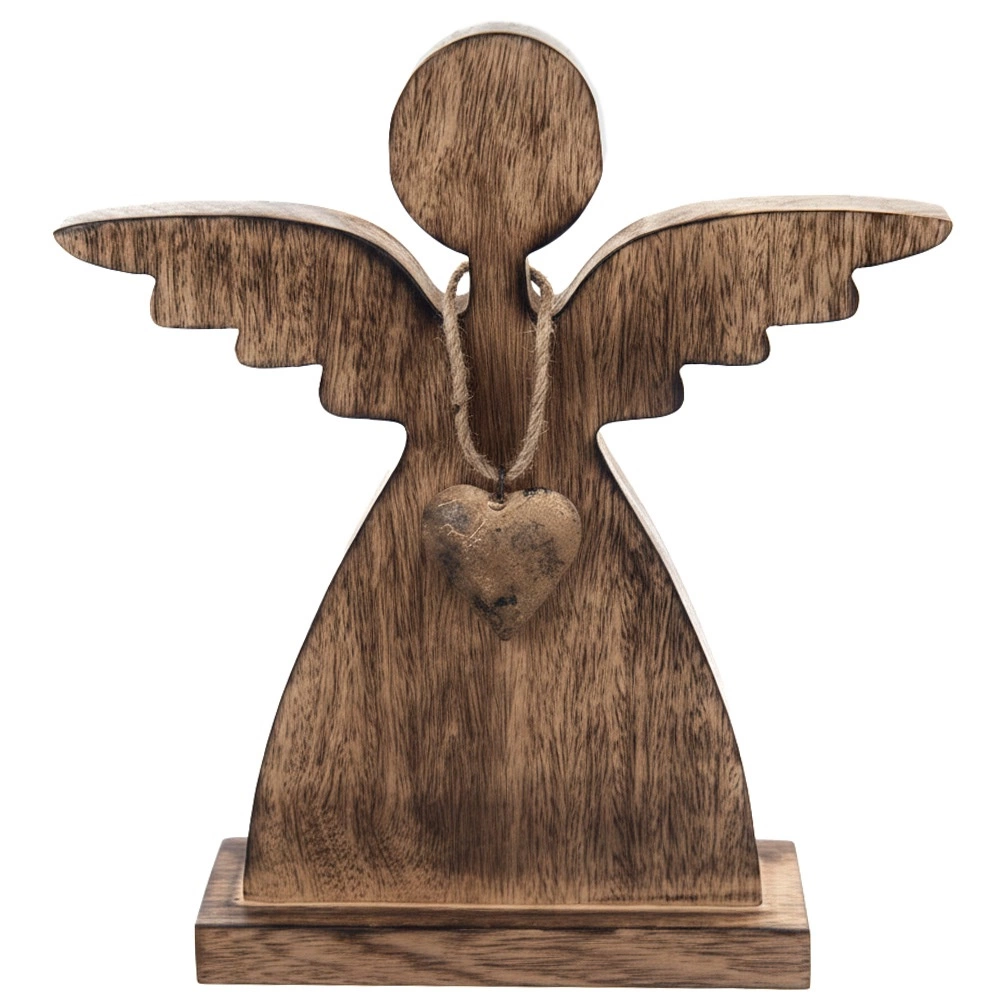 Deze engel van natuurlijk mangohout brengt rust en een knusse sfeer in huis. Minimalistische lijnen, subtiel gestileerde vleugels en een metalen hartje in goud vormen een tijdloze combinatie die past in zowel moderne als rustieke interieurs. De stabiele voet garandeert een veilige plaatsing op tafel, plank of dressoir.