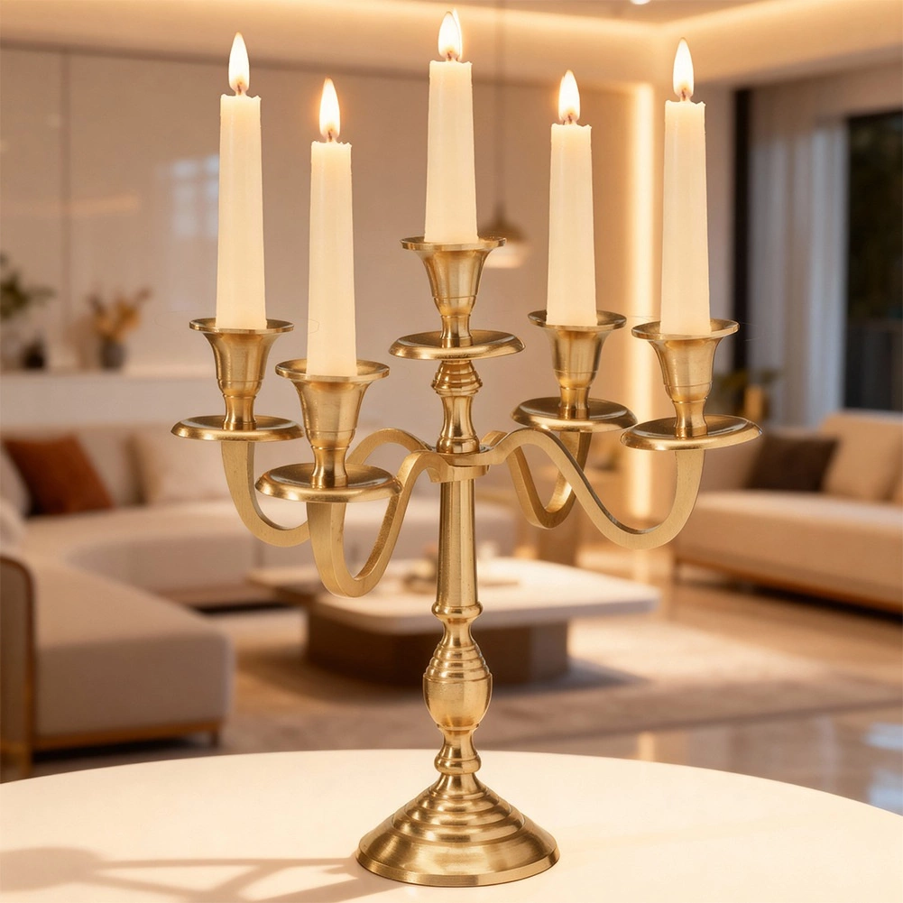 Maakt het schikken van vijf lange kaarsen mogelijk en verlicht tafel of dressoir gelijkmatig.