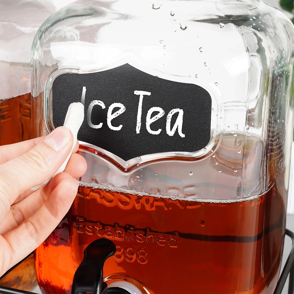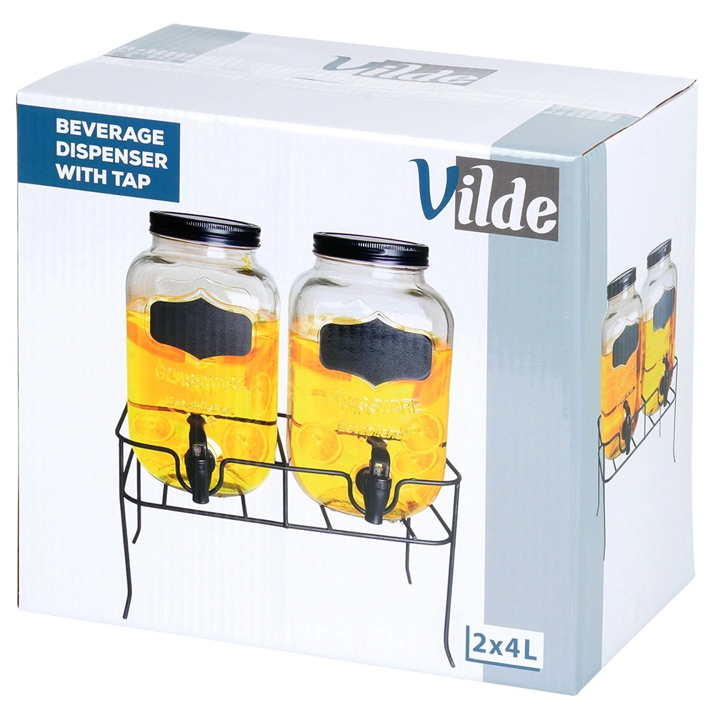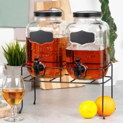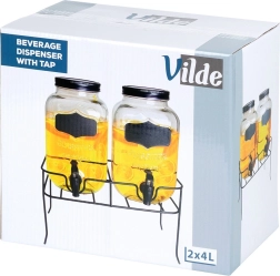 Deze praktische set van twee drankdispensers brengt orde en stijl in elke bediening. Elke glazen kan heeft een inhoud van 4 l en is uitgerust met een kunststof kraan met afdichting voor soepel schenken. Dankzij de brede opening is vullen met fruit of ijsblokjes eenvoudig, het deksel beschermt de drank tegen insecten en vuil. Het krijtbordvlak aan de voorzijde maakt het mogelijk de inhoud met krijt te labelen.