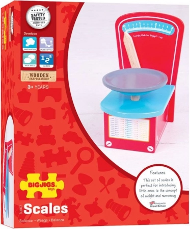 Deze volledig houten, functionele weegschaal van Bigjigs Toys is een ideale aanvulling op de kinderkeuken. Tijdens het rollenspel oefenen kinderen tellen, het inschatten van gewicht en sociale vaardigheden bij het samenspelen.