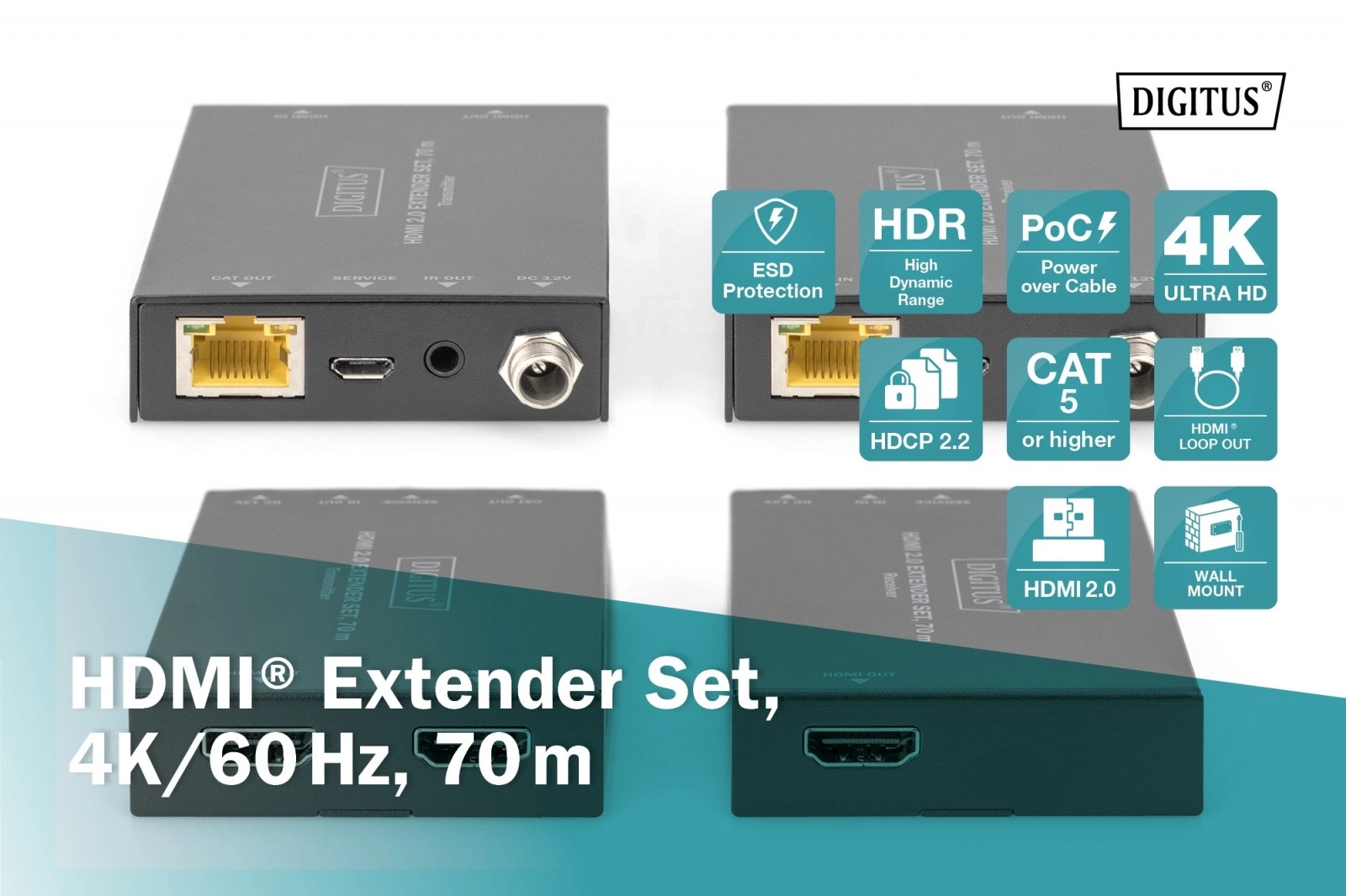- Lange afstand: tot 70 m (4K 30 Hz tot 70 m, 4K 60 Hz tot 60 m)