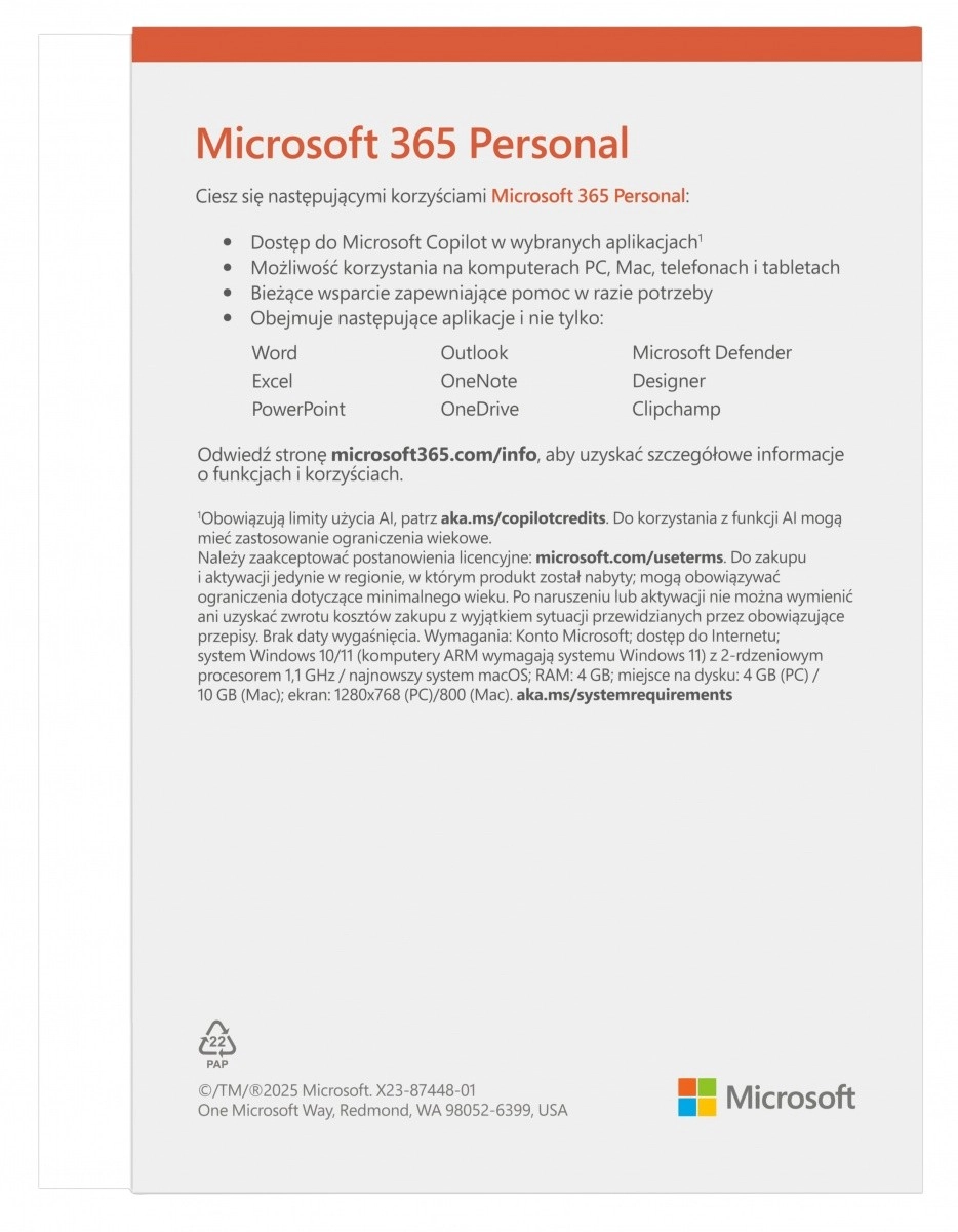 Haal je persoonlijke productiviteit naar het hoogste niveau met het abonnement Microsoft 365 Personal voor 1 gebruiker. Gebruik het op maximaal 5 apparaten tegelijk op PC, Mac, iPhone, iPad en Android. Inclusief 1 TB beveiligde OneDrive-cloudopslag, de apps Word, Excel, PowerPoint, Outlook en OneNote en slimme functies van Microsoft Copilot. Profiteer ook van Microsoft Designer, Clipchamp en geavanceerde bescherming met Microsoft Defender.