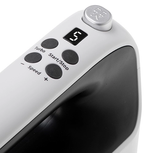 Het overzichtelijke display toont de gekozen snelheid en laat je het vermogen fijn afstemmen voor zowel delicate deegjes als zwaarder mixwerk.