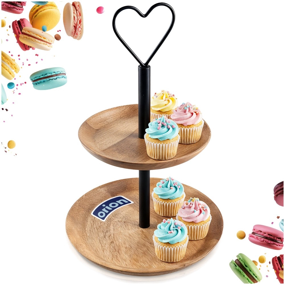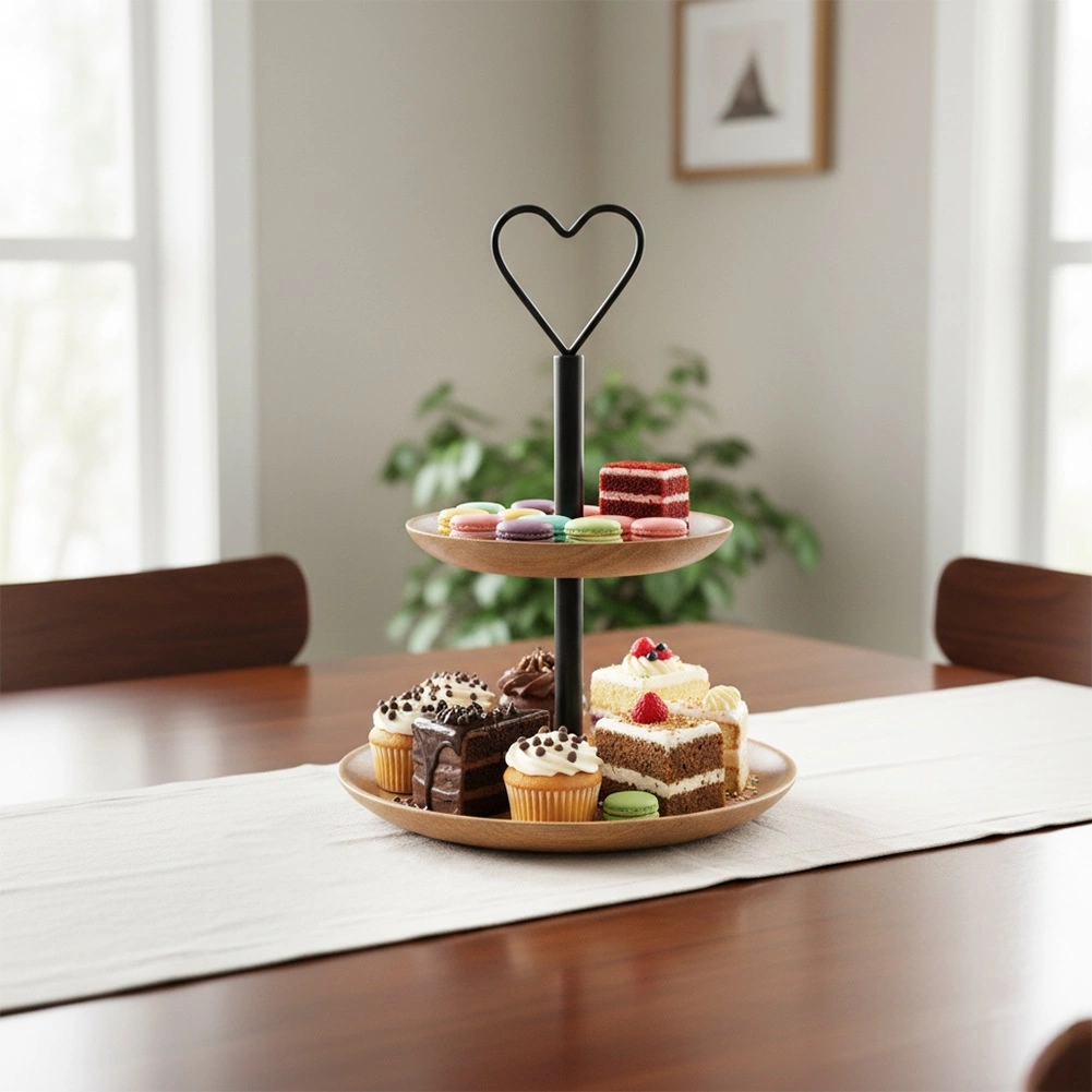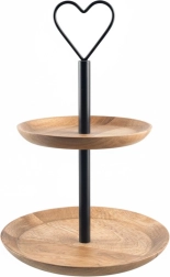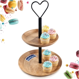 Stijlvolle tweelaagse schaal van mangohout met een hoogte van 37 cm en een metalen handvat in de vorm van een hart, ideaal voor het serveren van desserts, fruit en snacks. Dankzij het natuurlijke mangohout is hij duurzaam en stabiel, en de twee niveaus met een diameter van 25,5 cm en 20 cm zorgen voor een overzichtelijke presentatie. De praktische opvouwbare constructie en het makkelijke draaggemak zijn geschikt voor zowel thuis als professioneel gebruik.