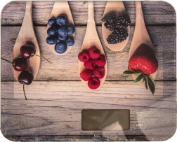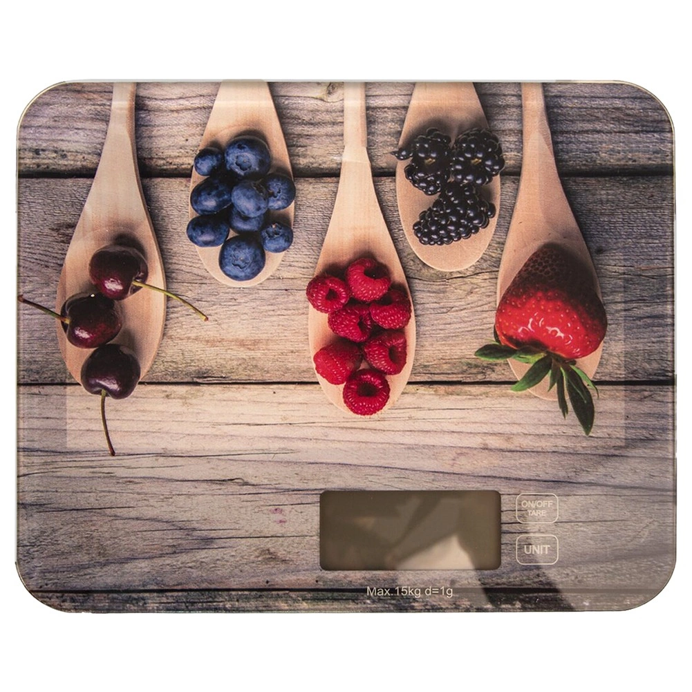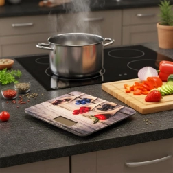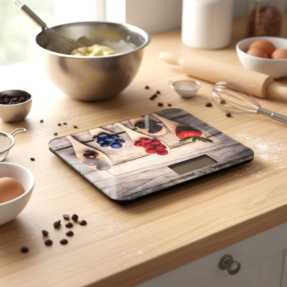 Deze digitale keukenweegschaal combineert een moderne look met praktische functies. Het geharde glas met een decoratief fruitmotief is duurzaam en onderhoudsvriendelijk, het grote LCD-scherm zorgt voor comfortabel en snel aflezen. Dankzij het draagvermogen van 15 kg weegt hij zowel kleine ingrediënten als zwaardere schalen.