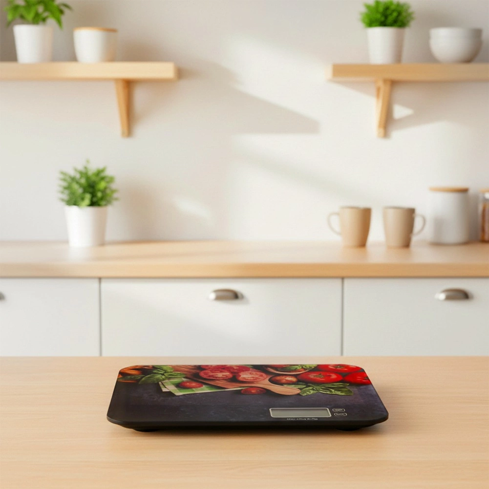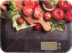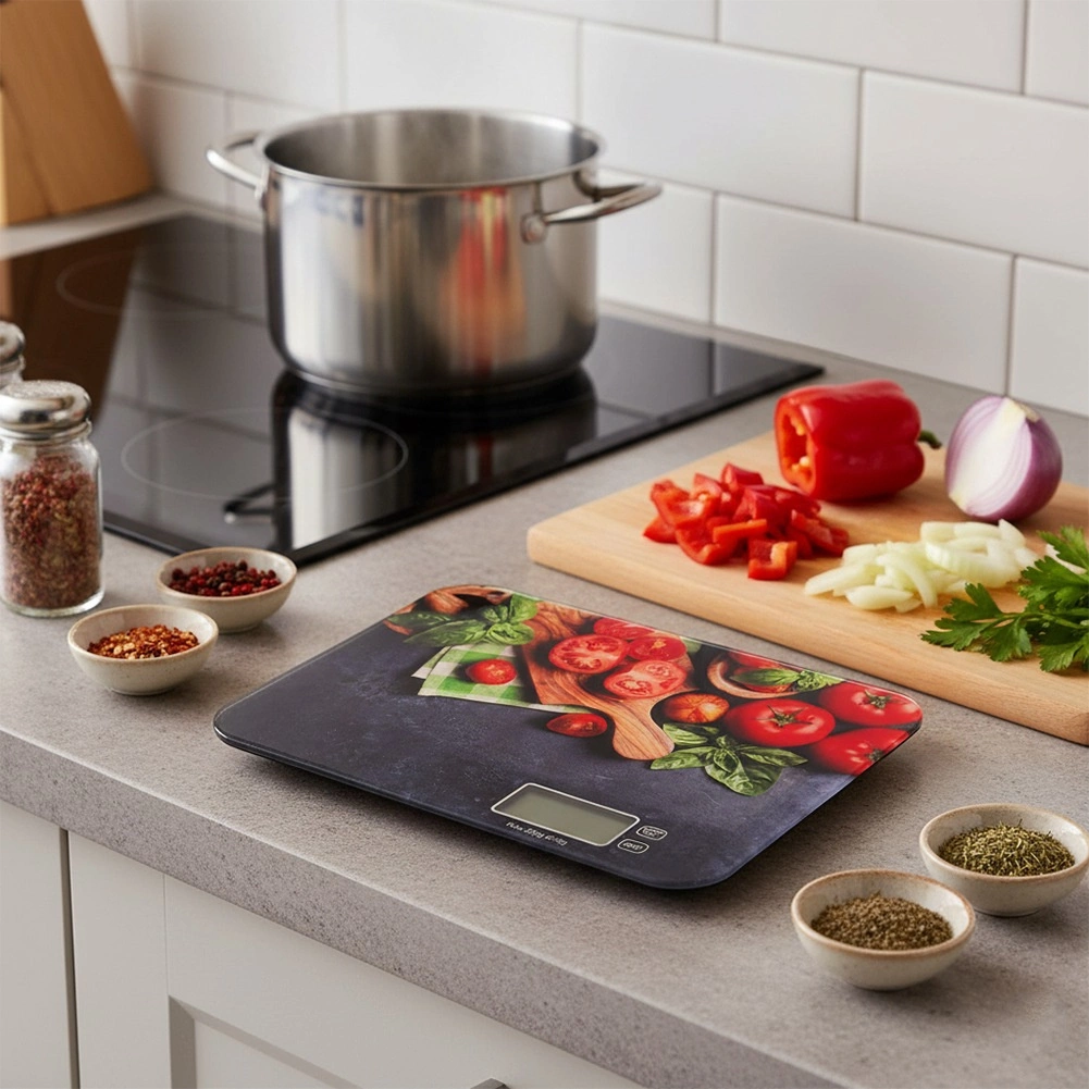 Stijlvolle glazen keukenweegschaal met een draagvermogen tot 20 kg en een nauwkeurig LCD-scherm. Biedt meerdere meeteenheden (g, kg, lb, oz, ml, fl.oz), TARE-functie, automatische uitschakeling en antislipvoetjes. Dankzij het geharde glas met een decoratief tomatenmotief is hij gemakkelijk te reinigen en past hij perfect in een moderne keuken.