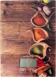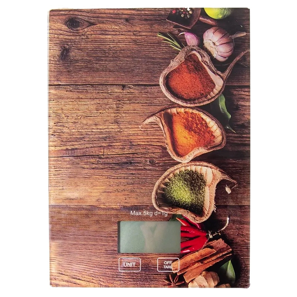 Compacte glazen keukenweegschaal met een draagvermogen van 5 kg en een nauwkeurig LCD-display voor snel en precies wegen van ingrediënten. Biedt meerdere meeteenheden (g, oz, ml, lb/oz, fl oz), een handige TARE-functie, automatische uitschakeling voor energiebesparing en antislipvoetjes voor stabiliteit. De stijlvolle kruidenprint past perfect in elke keuken.