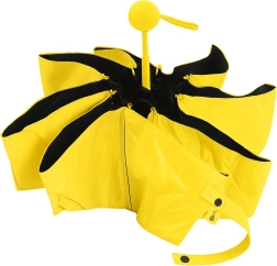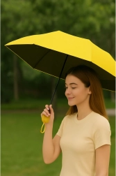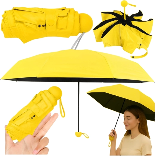 Stijlvolle gele paraplu met een diameter van 90 cm, die een compact opvouwbaar ontwerp, laag gewicht en hoge UV-bescherming UPF 50+ combineert. Dankzij de slijtvaste polyesterstof, de comfortabele bolvormige handgreep en het meegeleverde beschermetui is hij ideaal voor in handtas of rugzak – voor zowel regen als zon.
