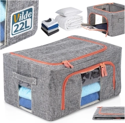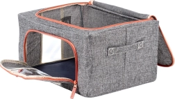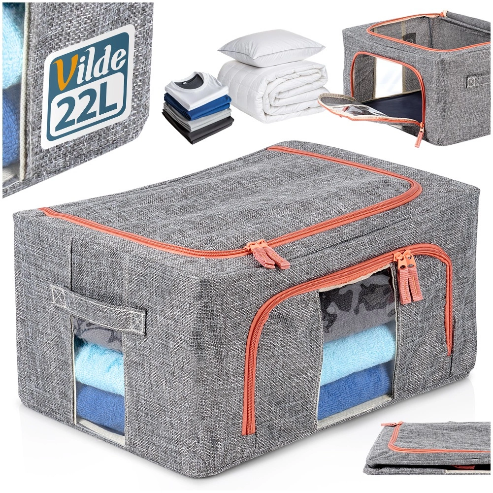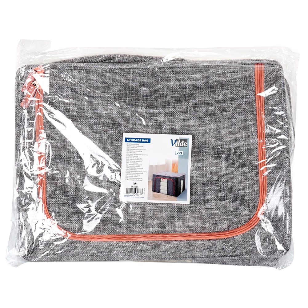 Houd orde in je kledingkast en onder het bed. De duurzame textielorganizer van polyester in grijze melange met contrasterende rits biedt een schone en veilige opslag voor beddengoed en seizoenskleding. Het transparante venster maakt directe controle van de inhoud mogelijk zonder te openen en het metalen frame behoudt de vorm, zodat de box niet inzakt.
