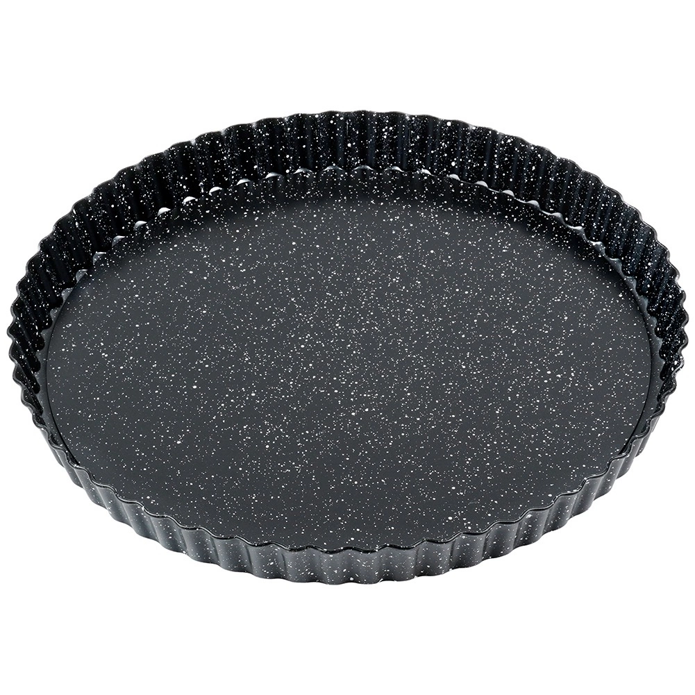 Praktische ronde taartvorm met een uitneembare bodem voor gemakkelijk lossen zonder de randen te beschadigen. Duurzaam koolstofstaal met granieten antiaanbaklaag zorgt voor egale garing en eenvoudig schoonmaken. Geribde randen vormen een decoratieve korst, ideaal voor zoete en hartige taarten, quiches en ovengerechten. Afmetingen 28 × 3 cm, ovenbestendig tot 230 °C.