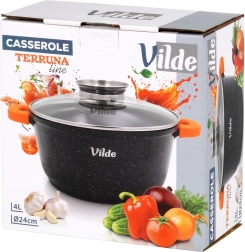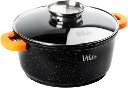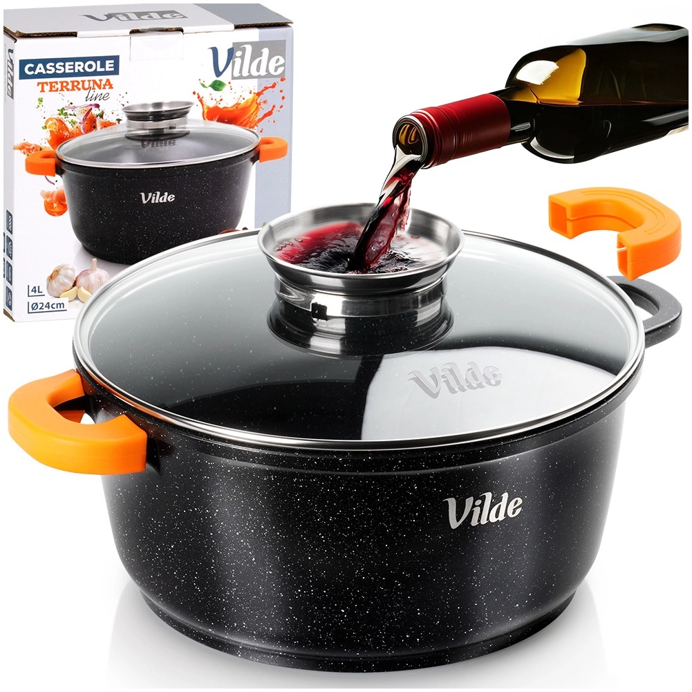 Ontdek de praktische VILDE-pan uit de TERRUNA AROMA-lijn, die een duurzaam gegoten aluminium lichaam combineert met een granieten antiaanbaklaag voor gezonder koken. Het glazen deksel met een brede roestvrijstalen greep en doseerder maakt het mogelijk wijn, water of bouillon toe te voegen zonder het deksel op te tillen, zodat het gerecht zijn temperatuur en aroma behoudt.