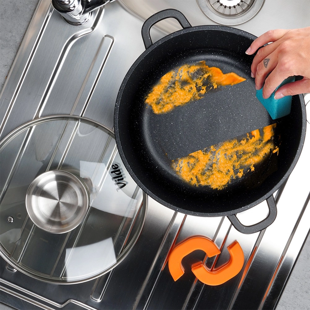 Twee robuuste zijhandgrepen met siliconen hoezen bieden zekerheid en comfort bij het dragen, zelfs wanneer de pan heet is. Dankzij de universele toepassing is hij ideaal voor soepen, stoven, goulash, ovengerechten en one-pot-maaltijden – en je kunt er direct stijlvol mee aan tafel serveren.