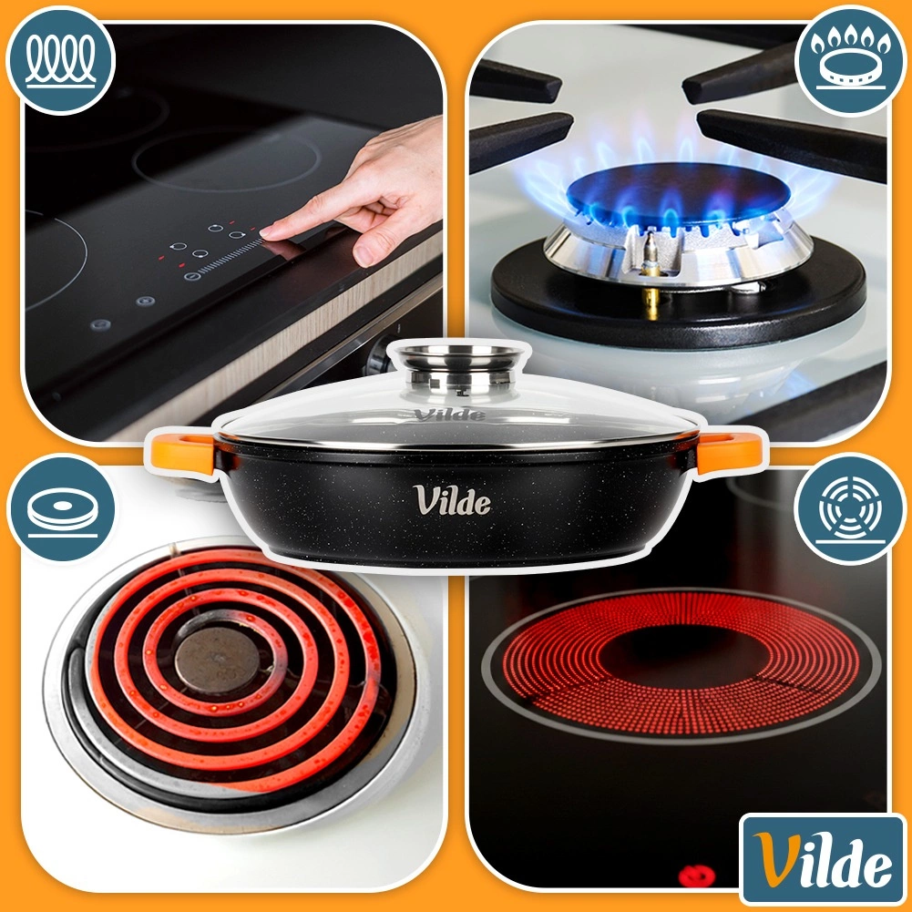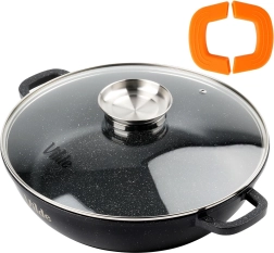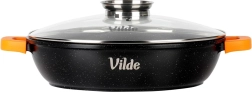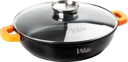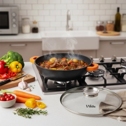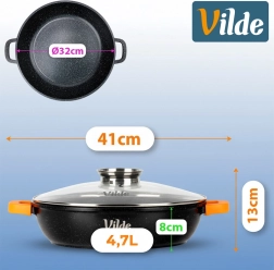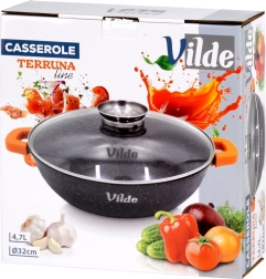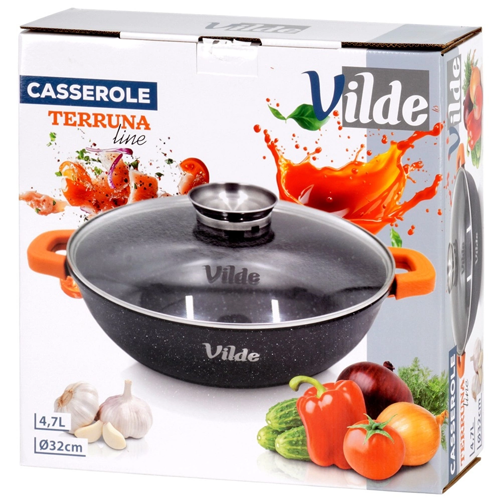 In de verpakking: pan 32 cm, glazen deksel met dispenser, oranje siliconen hoezen voor de handgrepen. Origineel product van het merk Vilde – lijn TERRUNA AROMA, vervaardigd volgens Europese normen.