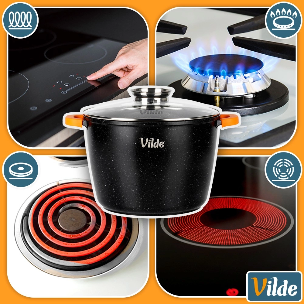 De meerlaagse bodem met inductieplaat zorgt voor een snelle warmteoverdracht en gelijkmatig koken op gas-, elektrische, keramische en inductiekookplaten.