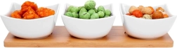 Deze 4-delige set combineert een minimalistisch design met functionaliteit. De drie witte porseleinen schaaltjes liggen op een stevig bamboe dienblad met gefreesde uitsparingen die schuiven voorkomen tijdens serveren en dragen. Perfect voor thuis of professionele catering.