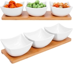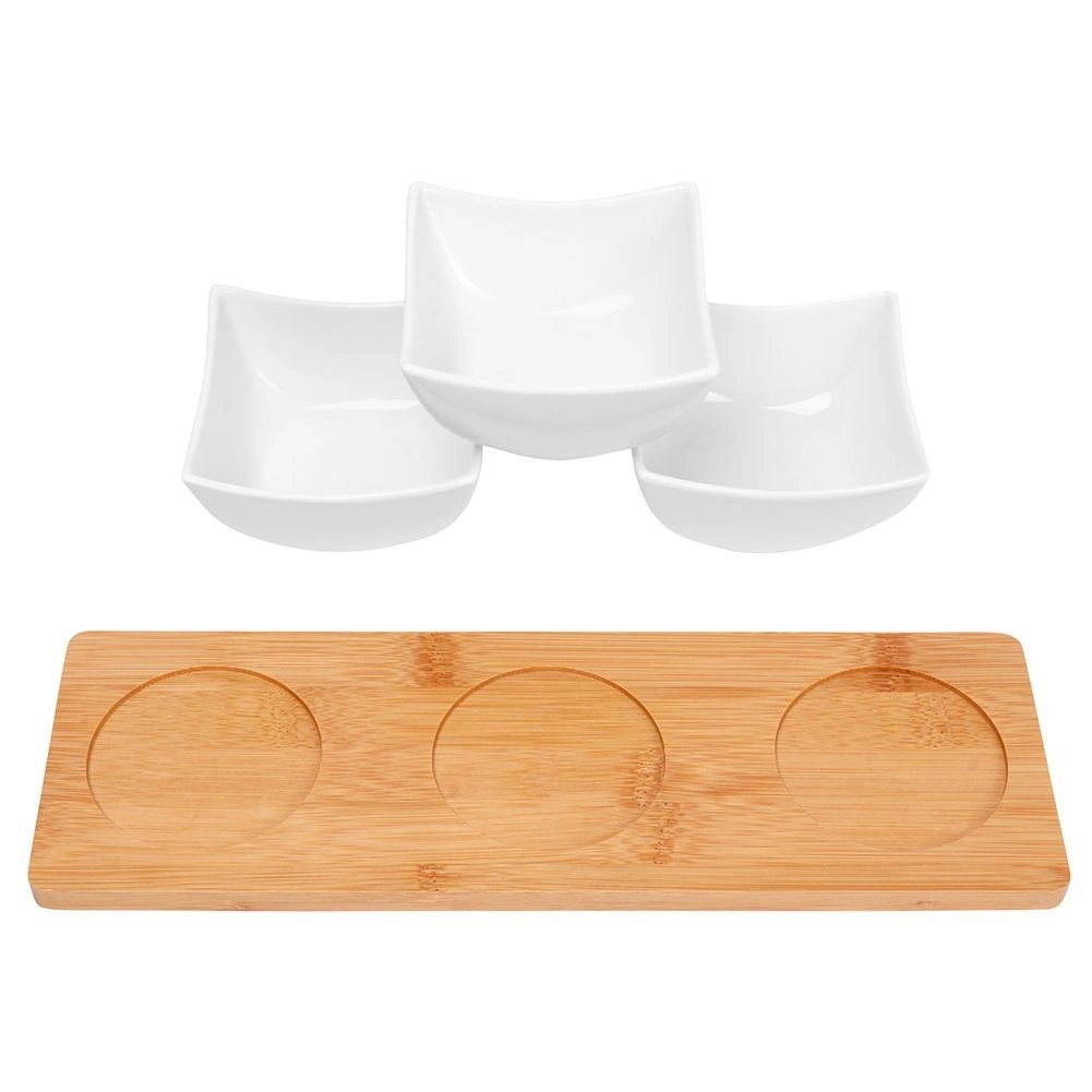 Een elegante set van drie witte porseleinen schaaltjes op een stijlvol bamboe dienblad, ideaal voor het serveren van hapjes, sauzen en dips. De schaaltjes hebben praktische uitsparingen in het blad voor stabiliteit tijdens het dragen en dankzij de compacte afmetingen passen ze op elke tafel.