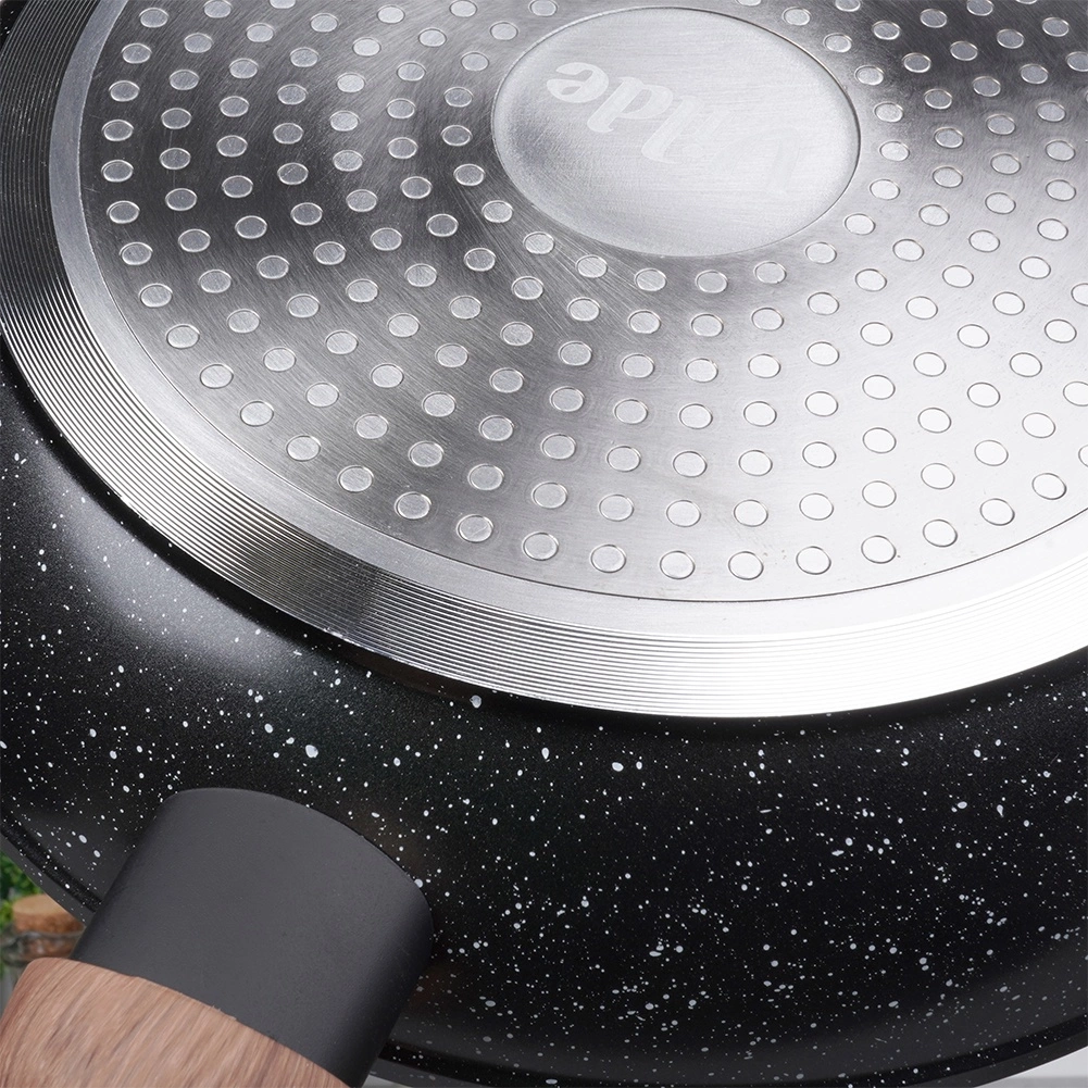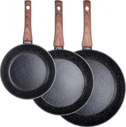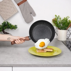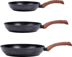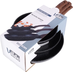 De BLACK&WOOD pannenset combineert een moderne look met praktische eigenschappen voor elke keuken. Drie universele maten (20/24/28 cm) dekken snelle ontbijten, lunches en familiediners. De duurzame granieten antiaanbaklaag zorgt voor soepel loslaten van gerechten, minder aanbranden en eenvoudiger onderhoud.
