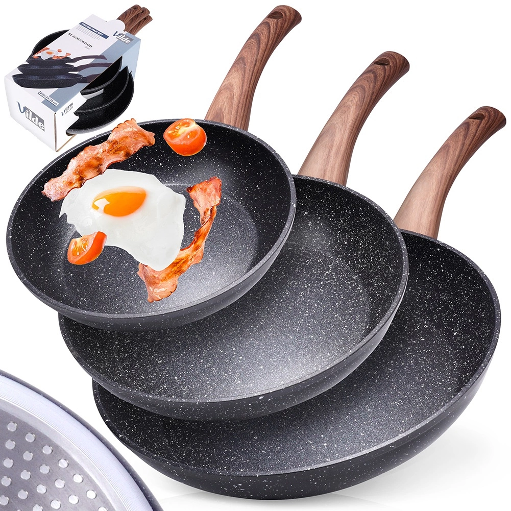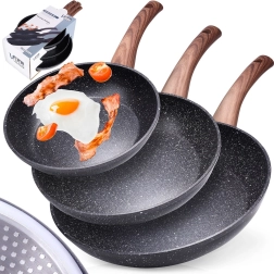 Stijlvolle set van drie pannen in de maten 20, 24 en 28 cm met een duurzame granieten antiaanbaklaag, gelijke warmteverdeling en ergonomische handgrepen met houtdecor. Geschikt voor alle soorten fornuizen inclusief inductie, eenvoudig te reinigen en vaatwasmachinebestendig. Ideaal voor gezond koken met minimale vetstof en voor dagelijks bakken en stoven.