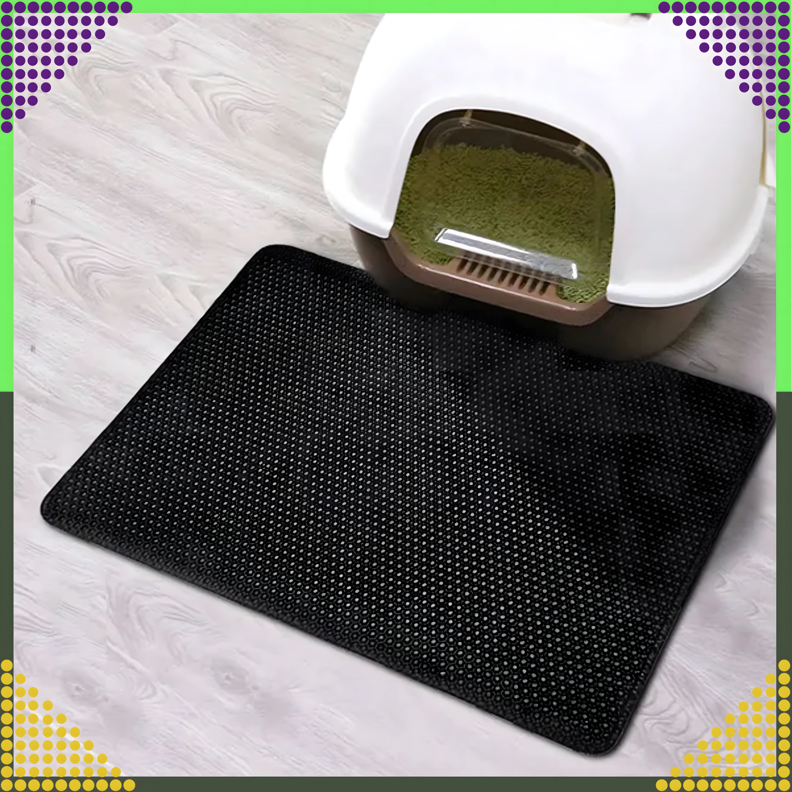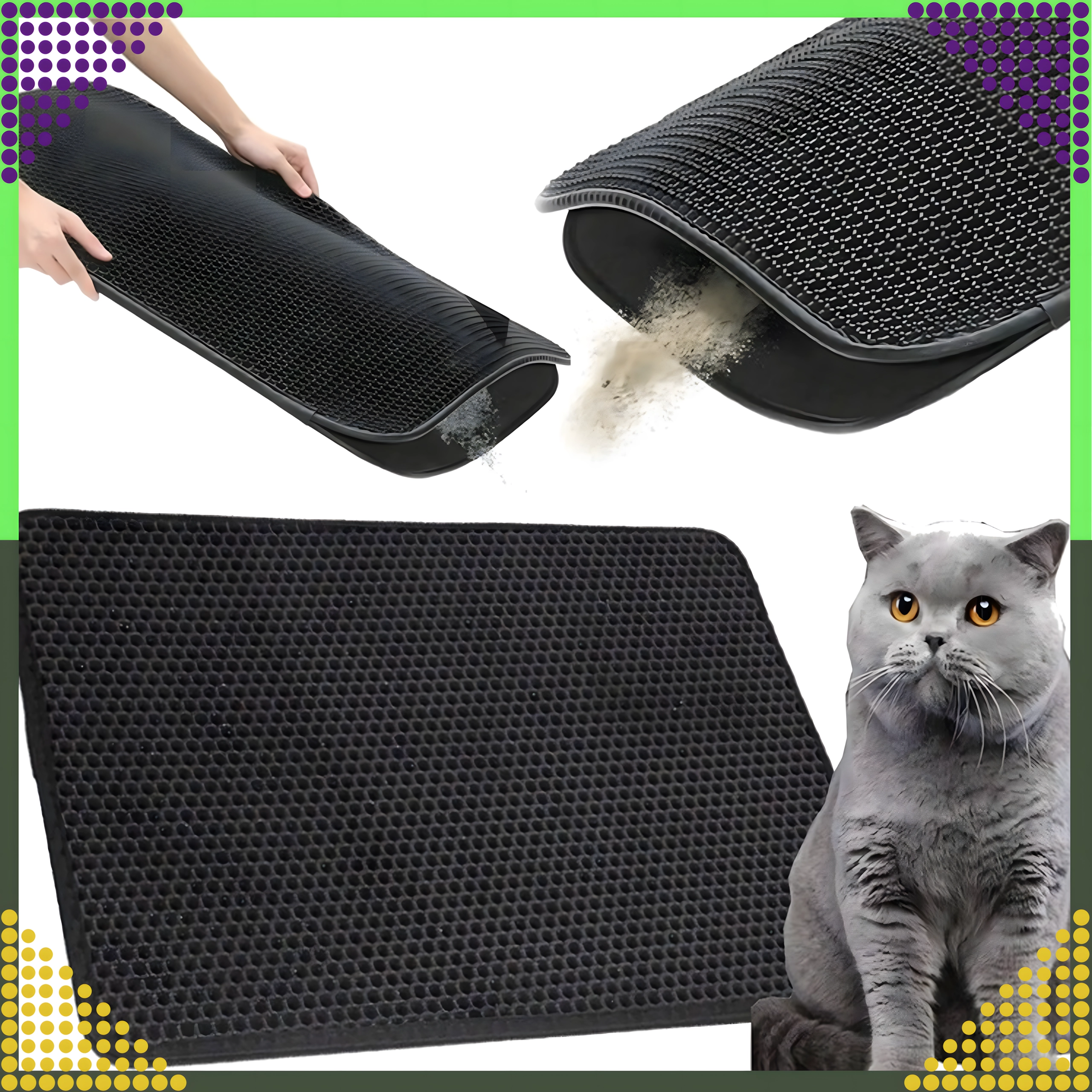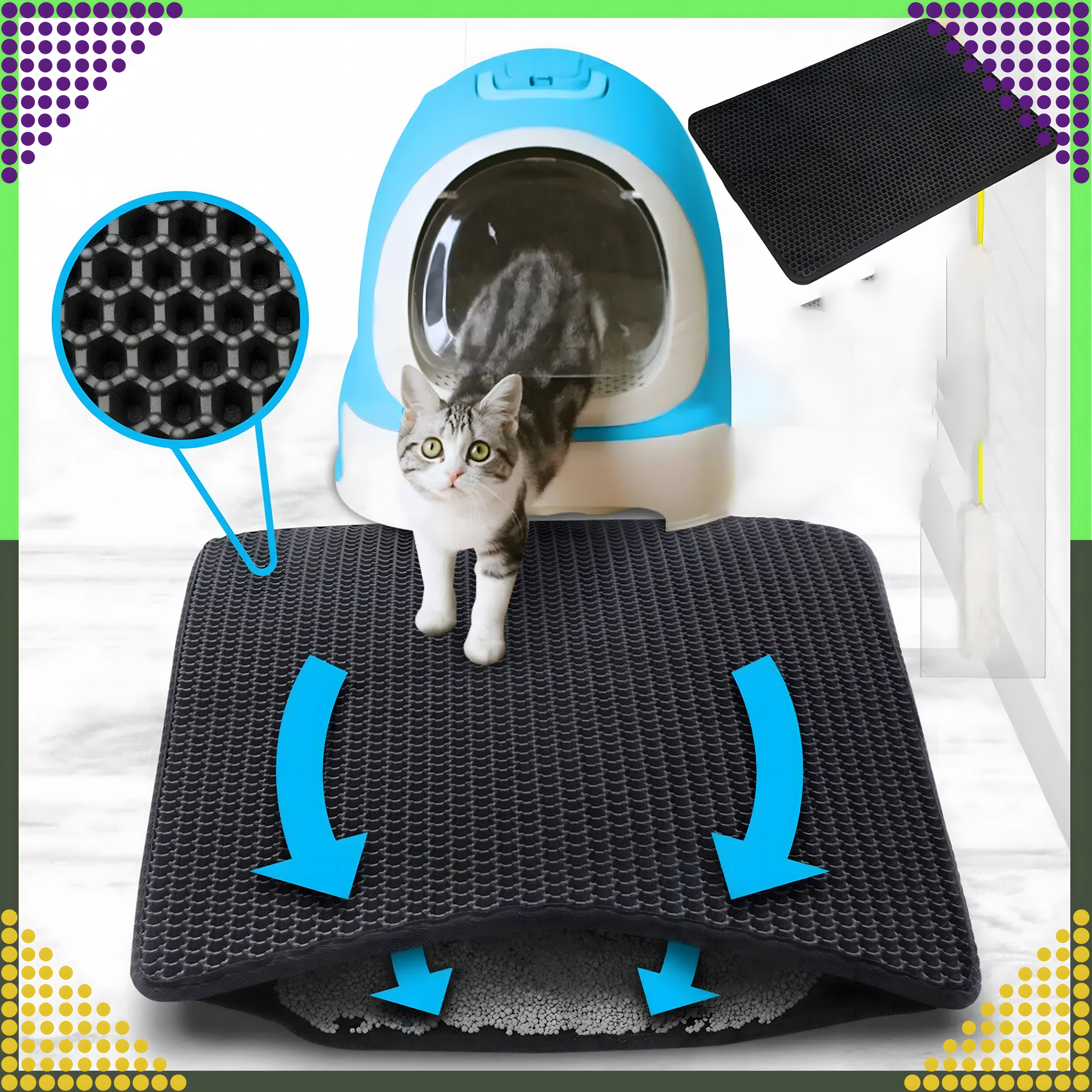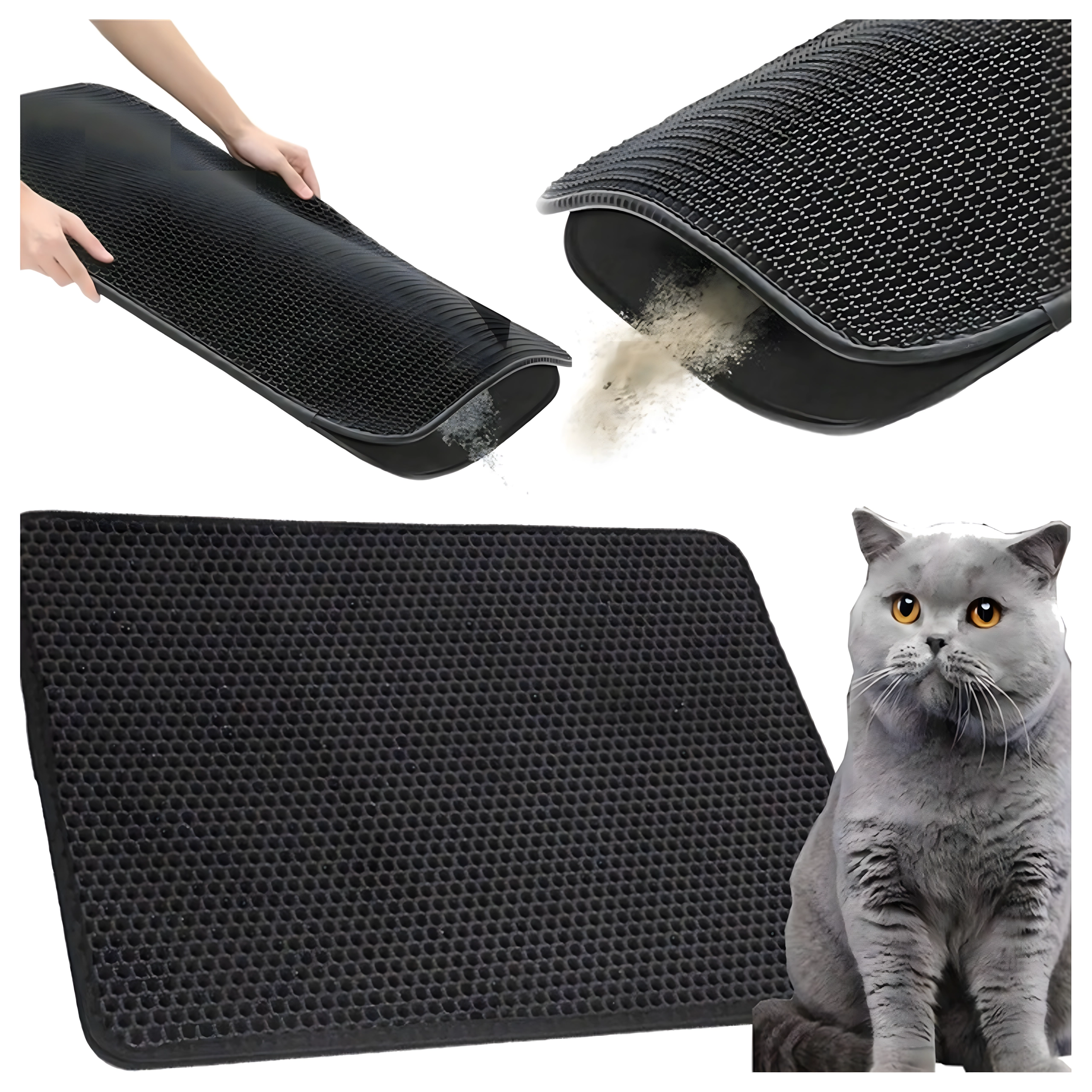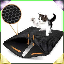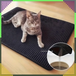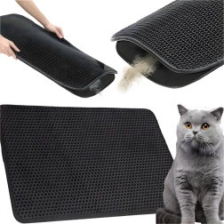 De praktische en hygiënische tweelaagse mat is ontworpen om korrels kattengrit op te vangen van de pootjes direct na het verlaten van de kattenbak. De bovenste honingraatlaag laat de korrels naar de onderste zak zakken, waar ze veilig worden verzameld – je kunt ze eenvoudig teruggooien in de kattenbak of in de prullenbak. Dankzij de antislip onderzijde schuift de mat niet weg en blijft stabiel liggen.