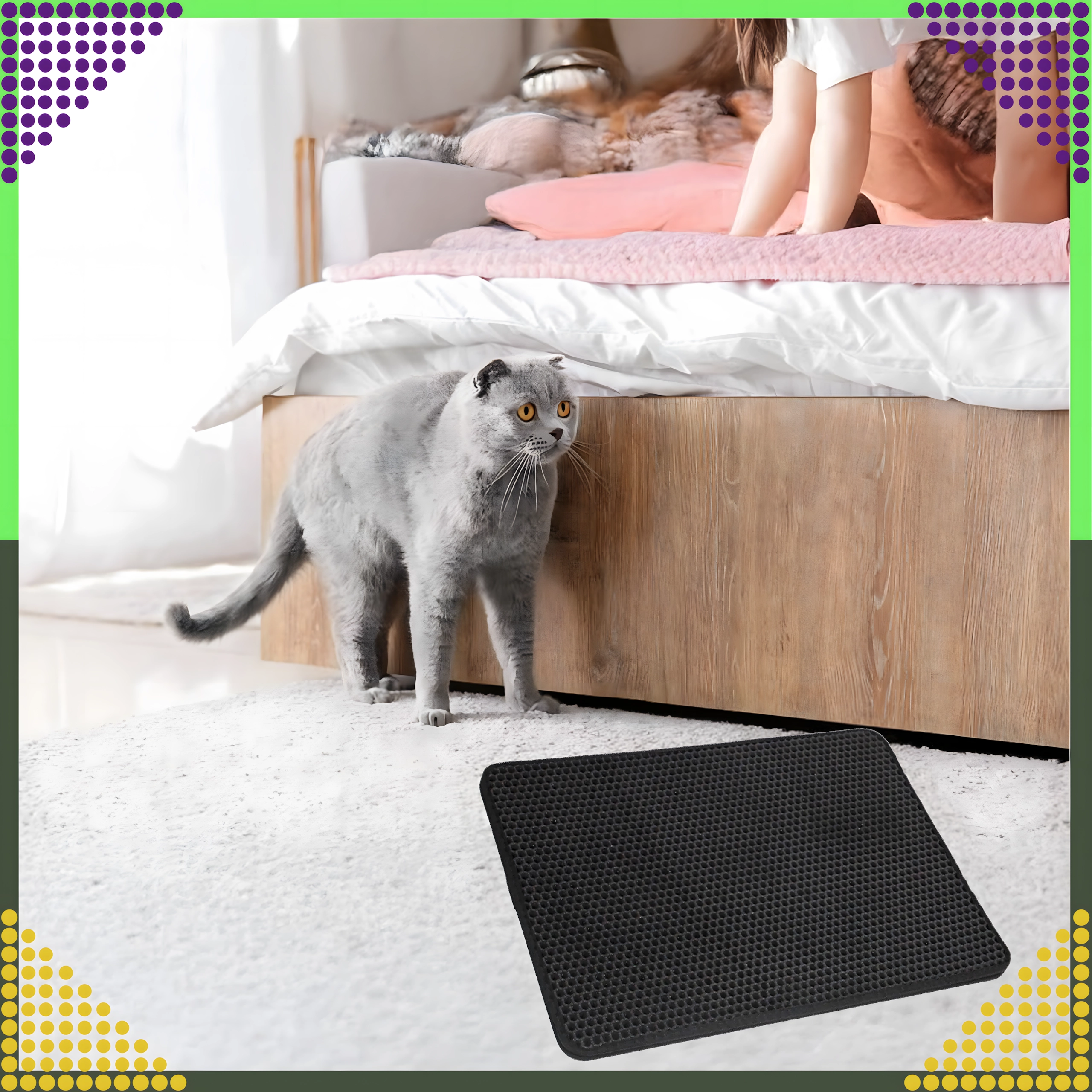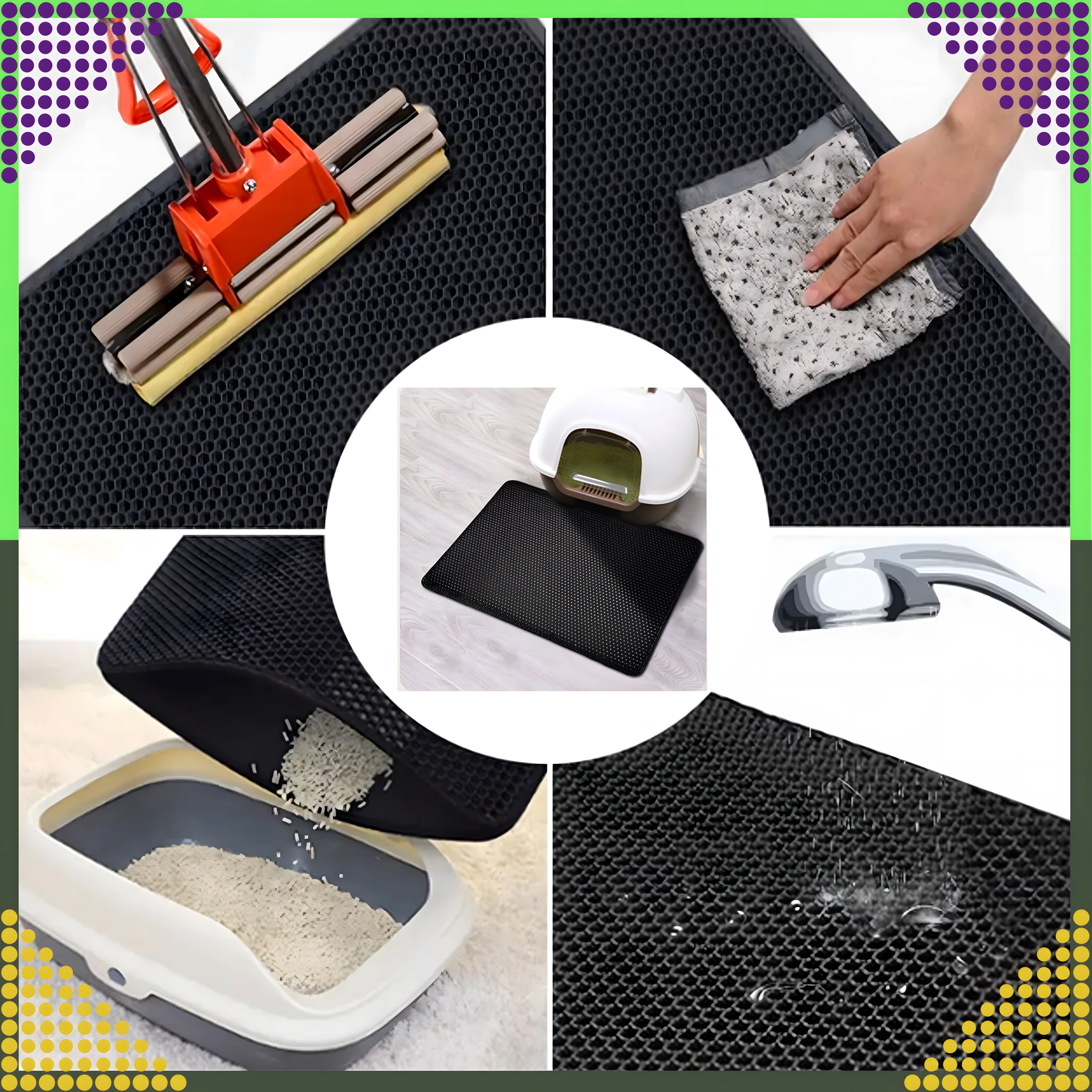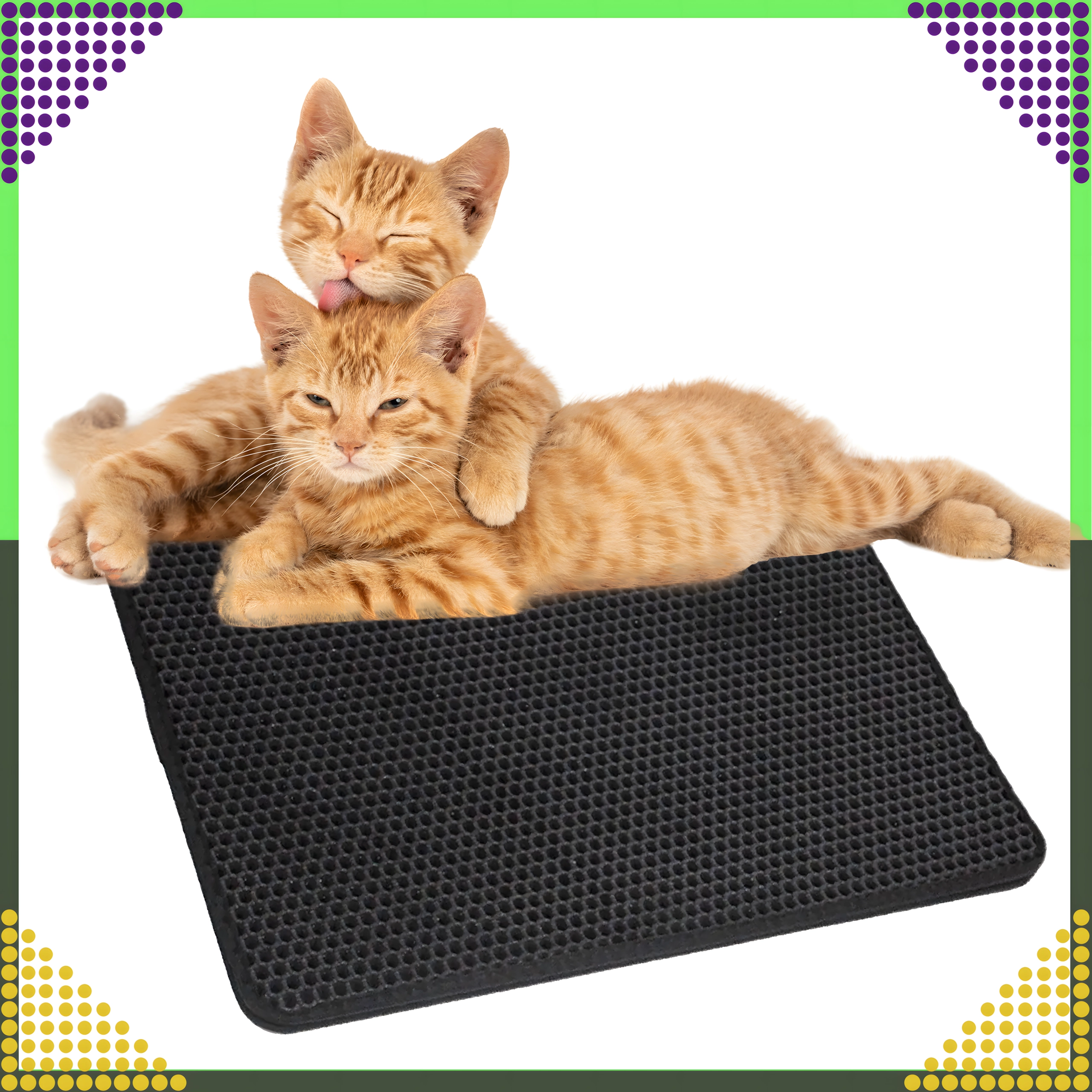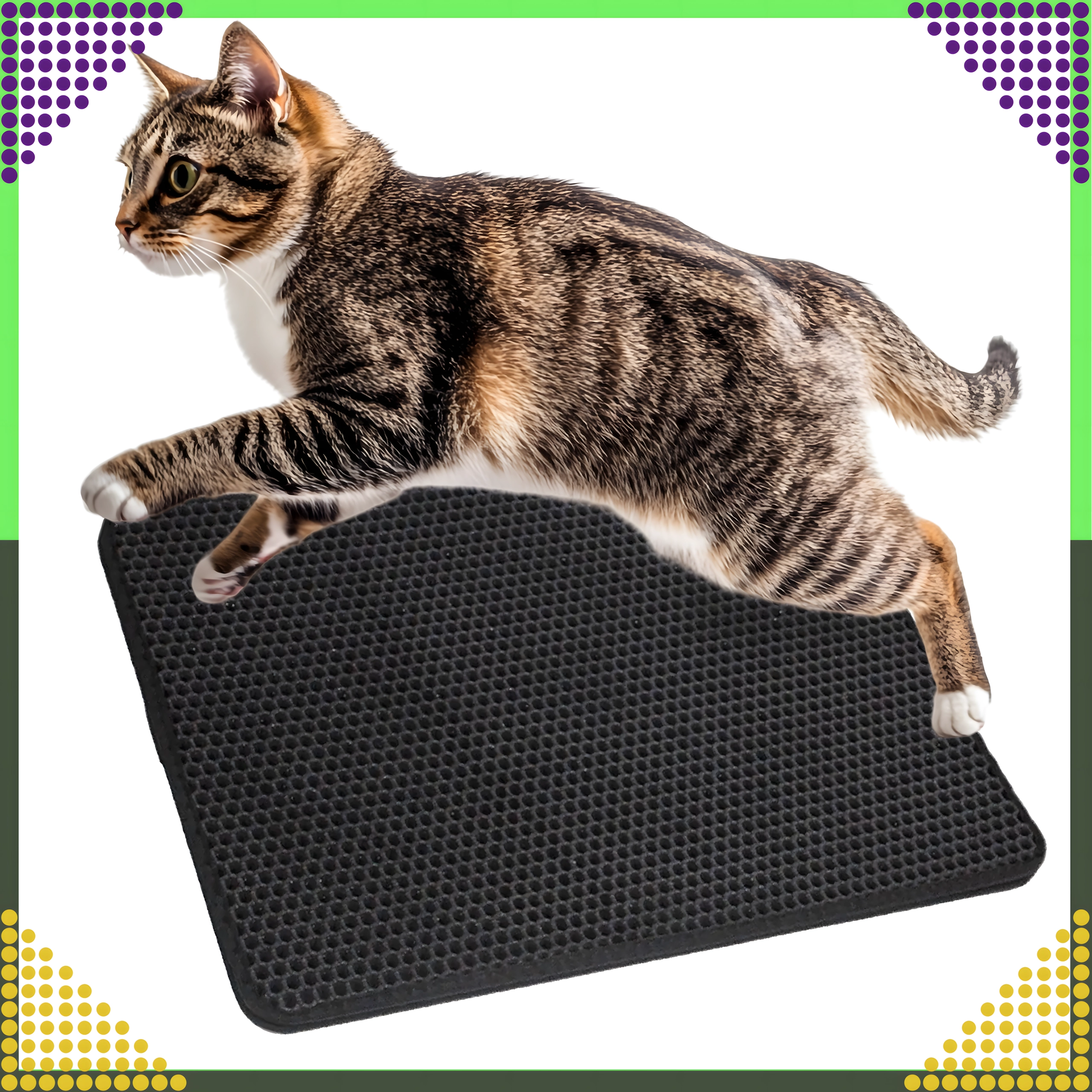 De praktische en hygiënische tweelaagse mat is ontworpen om korrels kattengrit op te vangen van de pootjes direct na het verlaten van de kattenbak. De bovenste honingraatlaag laat de korrels naar de onderste zak zakken, waar ze veilig worden verzameld – je kunt ze eenvoudig teruggooien in de kattenbak of in de prullenbak. Dankzij de antislip onderzijde schuift de mat niet weg en blijft stabiel liggen.