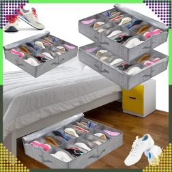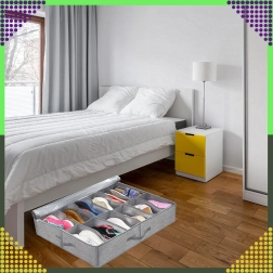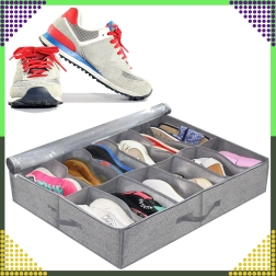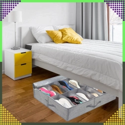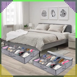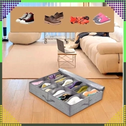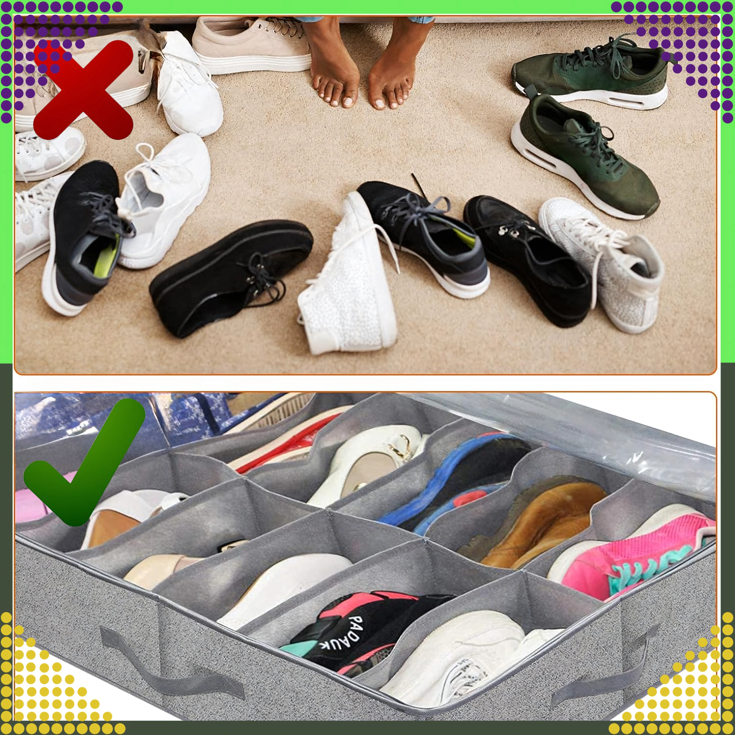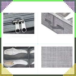 De interne verdeelvakken houden schoenparen gescheiden en overzichtelijk, zodat ze niet verfrommelen of door elkaar raken. De duurzame textielstof is prettig aan te raken en beschermt de inhoud. De zijhandgrepen maken verplaatsen eenvoudig, en wanneer je de organizer niet nodig hebt, vouw je hem plat op.