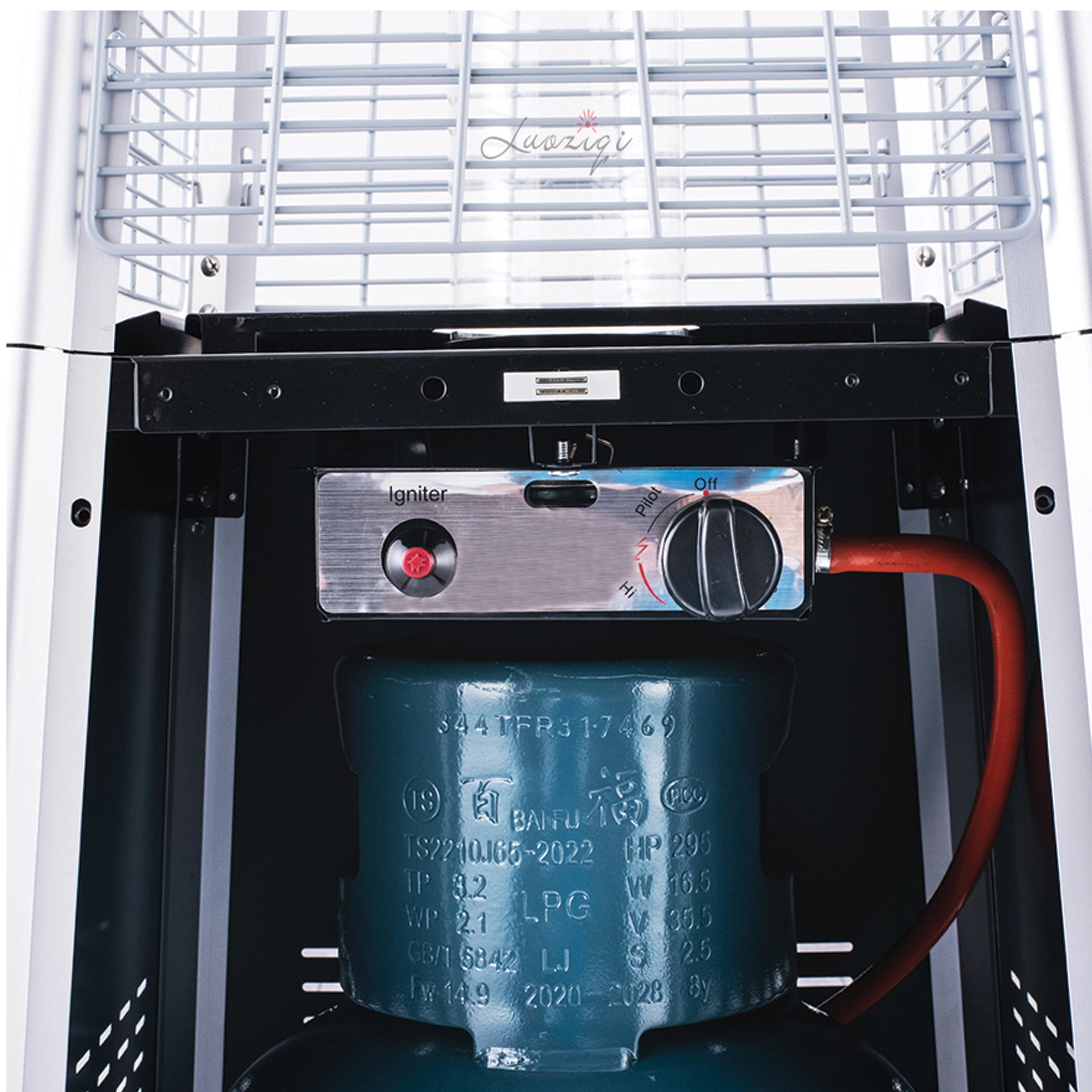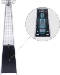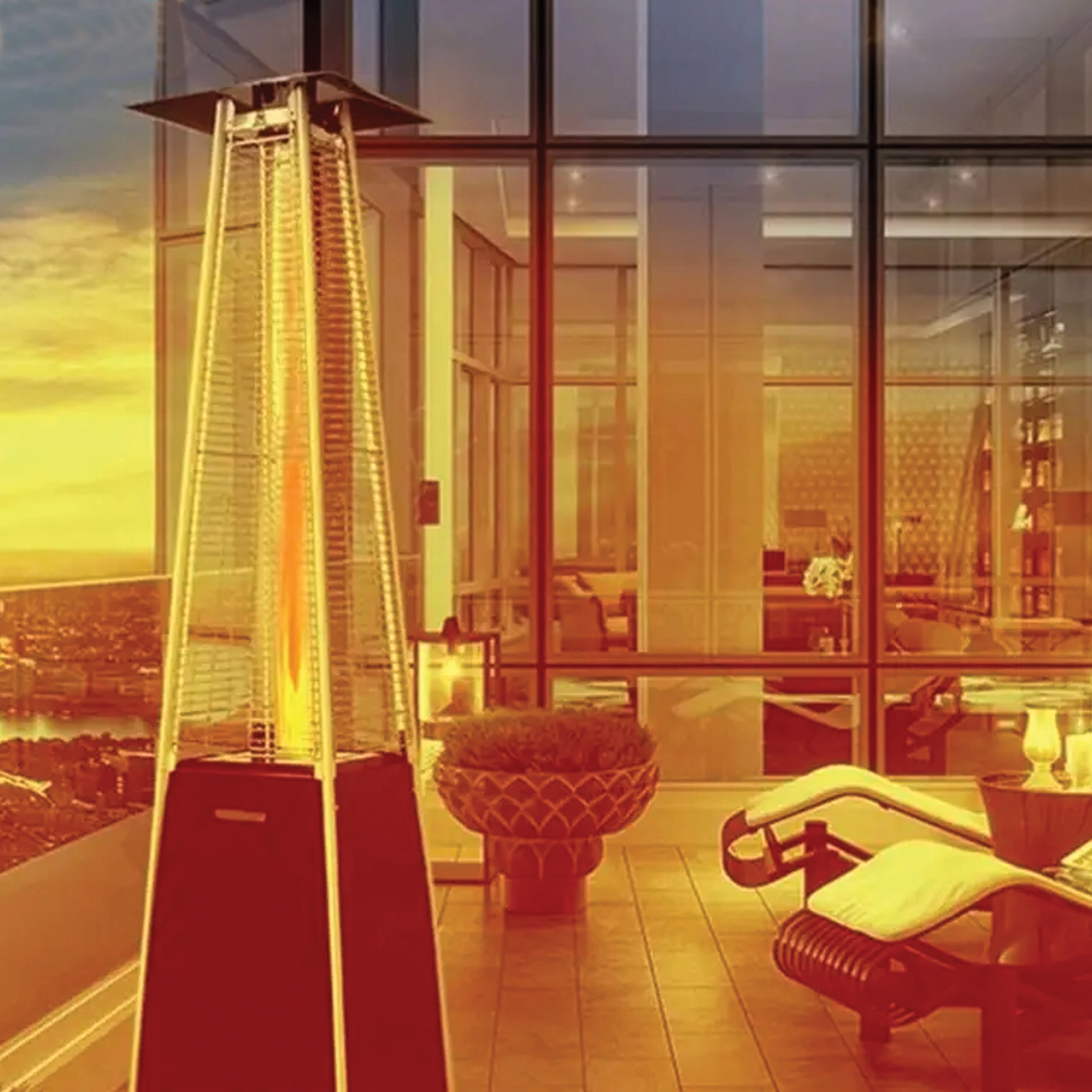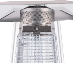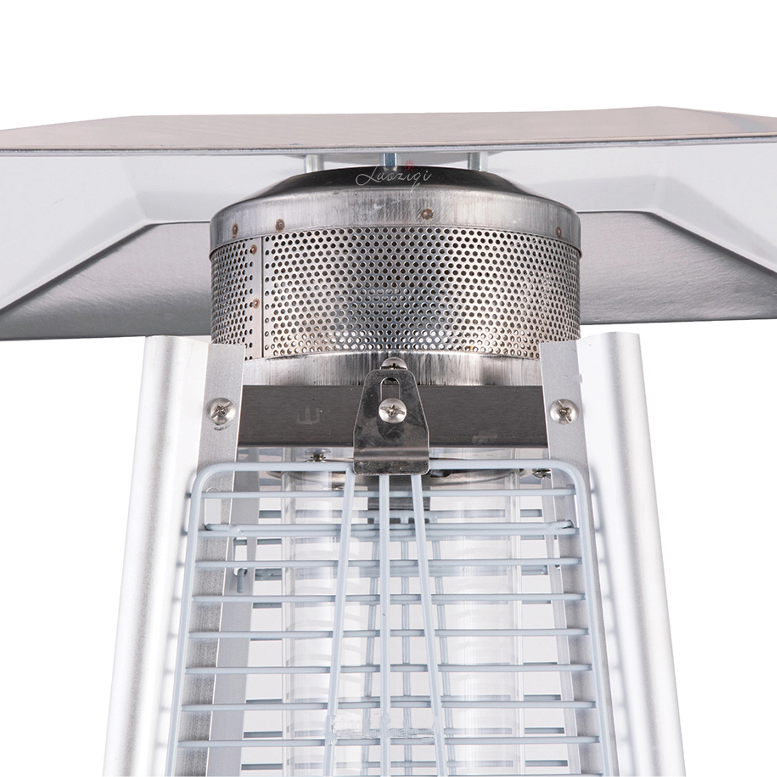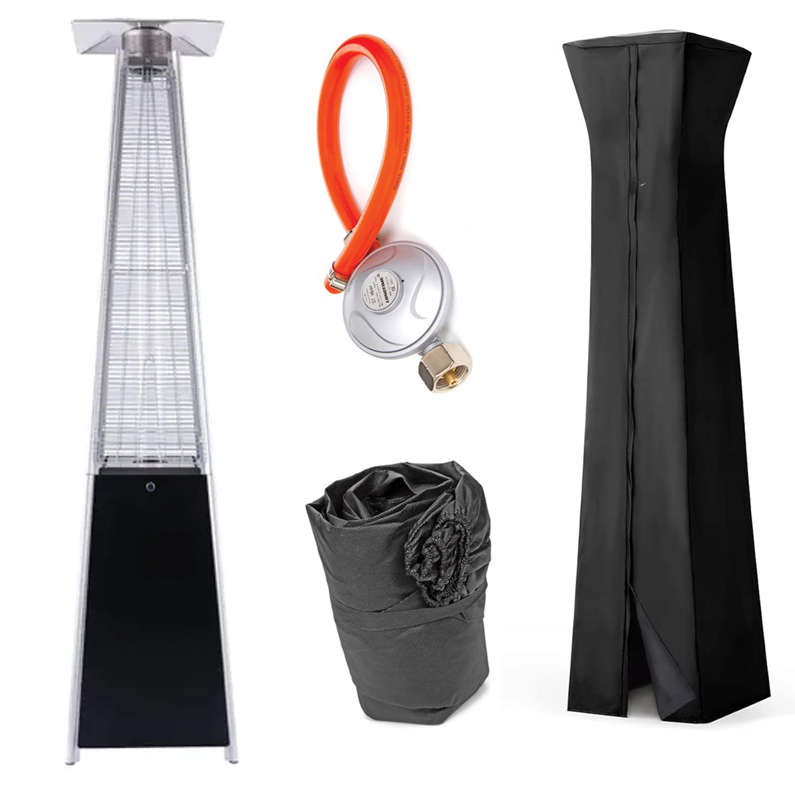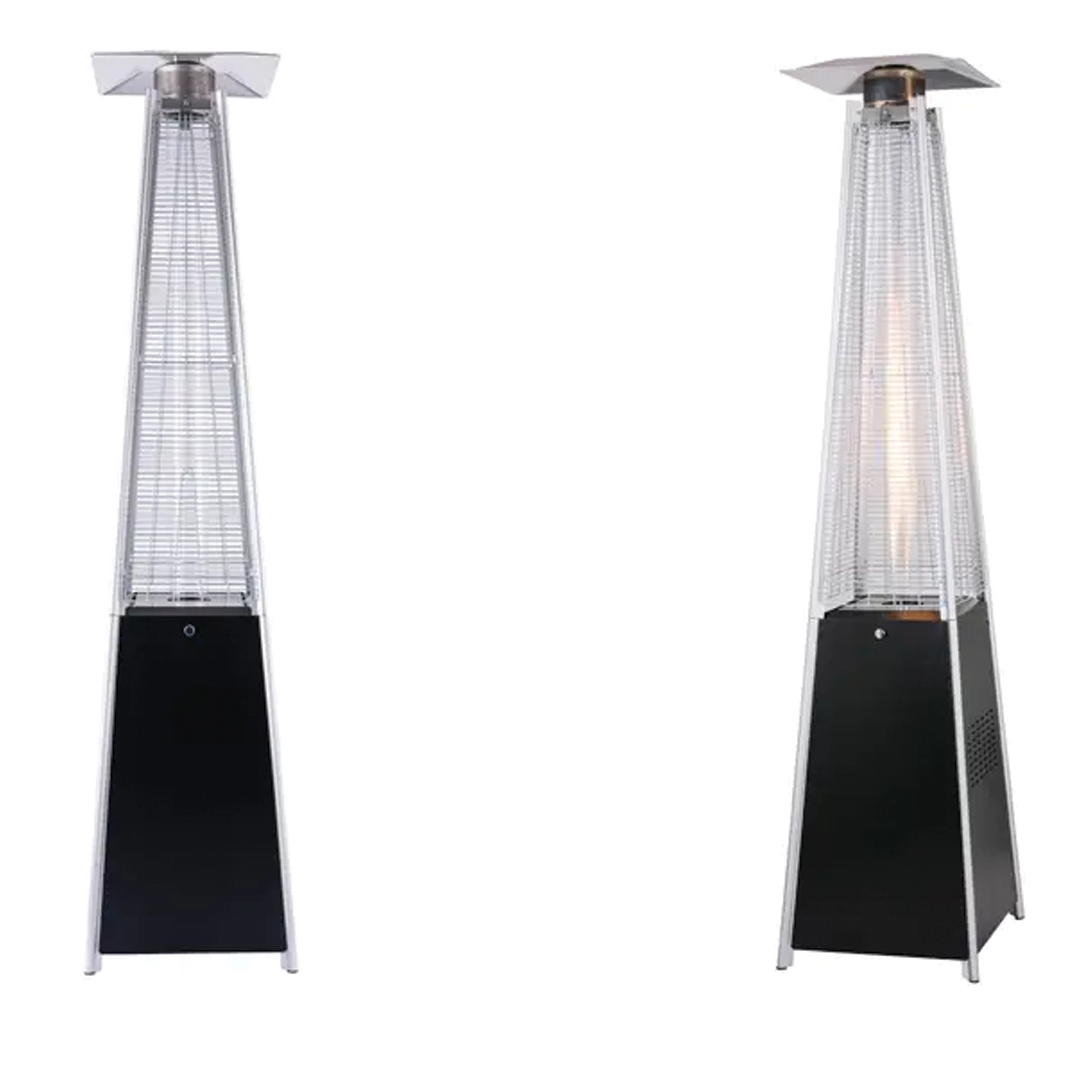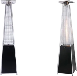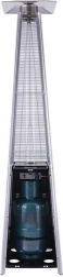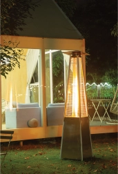 Deze gas-terrasverwarmer met modern piramidedesign creëert aangename warmte en sfeervol licht voor avonden buiten. De zichtbare vlam in de kwartsbuis is beschermd door een metalen rooster en straalt warmte naar de omgeving, zodat u ook op frissere dagen comfortabel buiten zit.