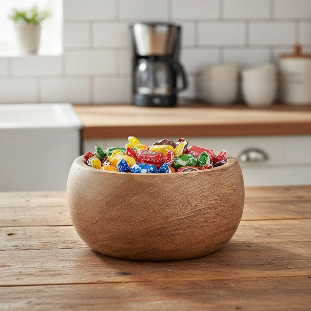 Elegante houten kom van mangohout met een inhoud van 450 ml en afmetingen 14 × 14 × 7 cm. Een veelzijdige keuze voor het serveren van snacks, salades en warme gerechten. Mangohout is vochtafstotend, droogt snel en neemt geen geuren op. De tijdloze look in natuurlijke tinten past in elke keuken en op elke feestelijke tafel.